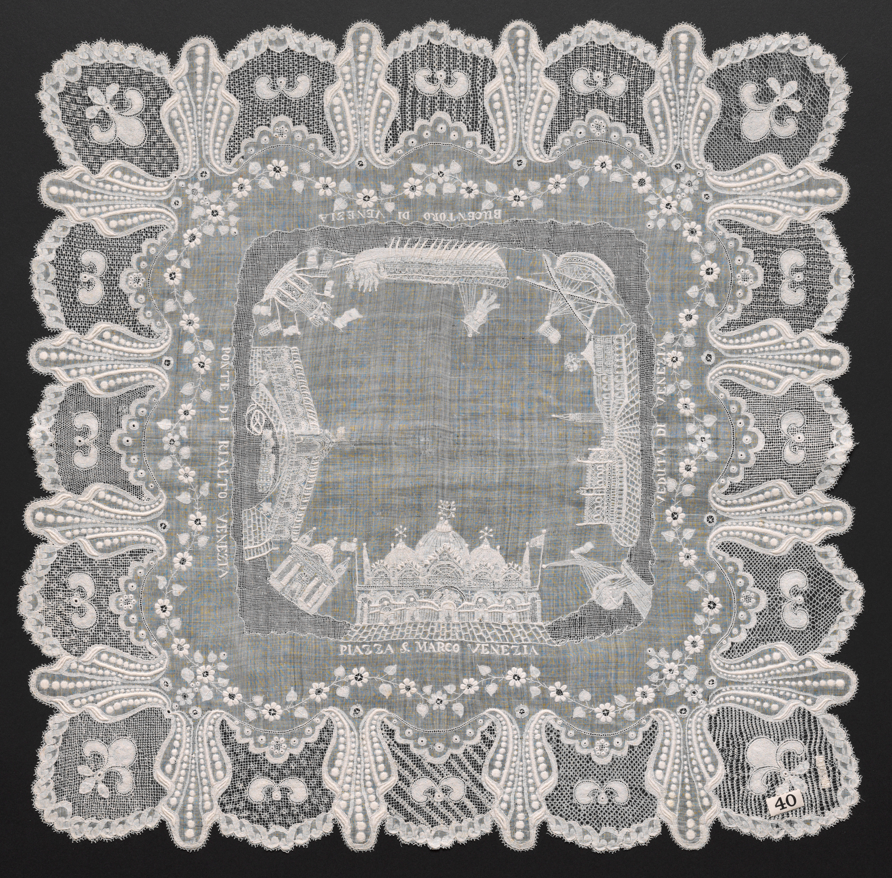Embroidered handkerchief by artist unknown. The handkerchief is square with an intricate white lace design and a gray interior. The lace design features a scalloped edge with floral patterns and shapes. Inside the lace, the gray interior has a central image depicting 'Piazza San Marco' and 'Basilica di Venezia' in white. The image shows architectural scenes and landmarks of Venice. The bottom features 'PIAZZA S MARCO VENEZIA' in white text. The background of the image is black.
