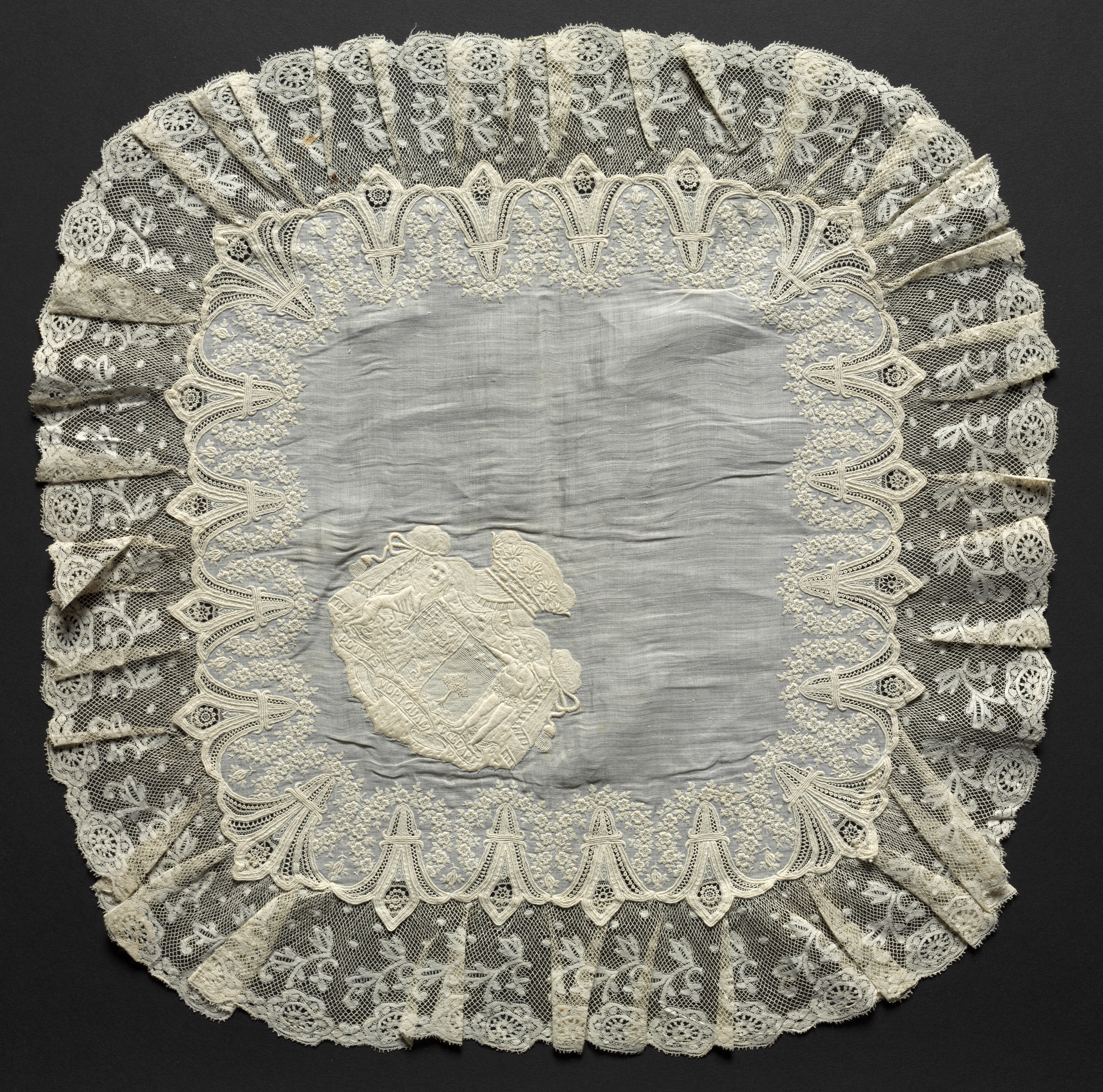 The Embroidered Handkerchief by an unknown artist features a square handkerchief with rounded corners. The handkerchief is made of light gray fabric with a large, intricate white lace border around the edges. The lace is ornate and features a repeating pattern of floral motifs and geometric shapes. The border is made up of multiple layers of lace, with a scalloped edge and a ruffled effect. In the center of the handkerchief, there is a large, embroidered design that appears to be a building or monument. The embroidery is done in white thread and features intricate details and textures. The handkerchief has a delicate and ornate appearance, suggesting it may be a decorative or ceremonial item. The background of the image is solid black, which helps to highlight the details of the handkerchief.