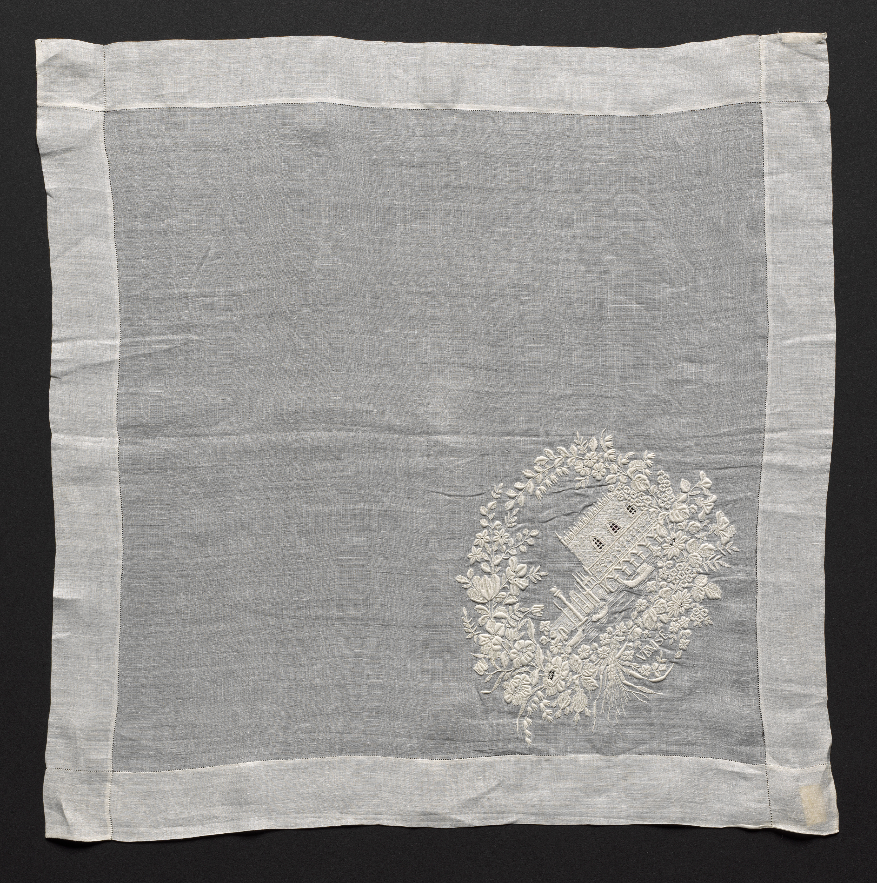 The Embroidered Handkerchief by an unknown artist shows a square piece of fabric with a white border and a gray center. The fabric has a wrinkled appearance and is made of a lightweight material, likely cotton or linen. The white border is stitched along the edges with small, even stitches. In the bottom-right corner of the gray center, there is an embroidered design featuring a house surrounded by flowers and foliage. The house has a pitched roof and a chimney, with a pathway leading up to it. The embroidery is done in white thread, matching the color of the border, and features intricate details such as leaves, stems, and flowers. The background of the image is solid black, which helps to highlight the details of the handkerchief. The overall appearance of the handkerchief suggests that it may be an antique or vintage item, possibly used for decorative purposes or as a functional accessory.