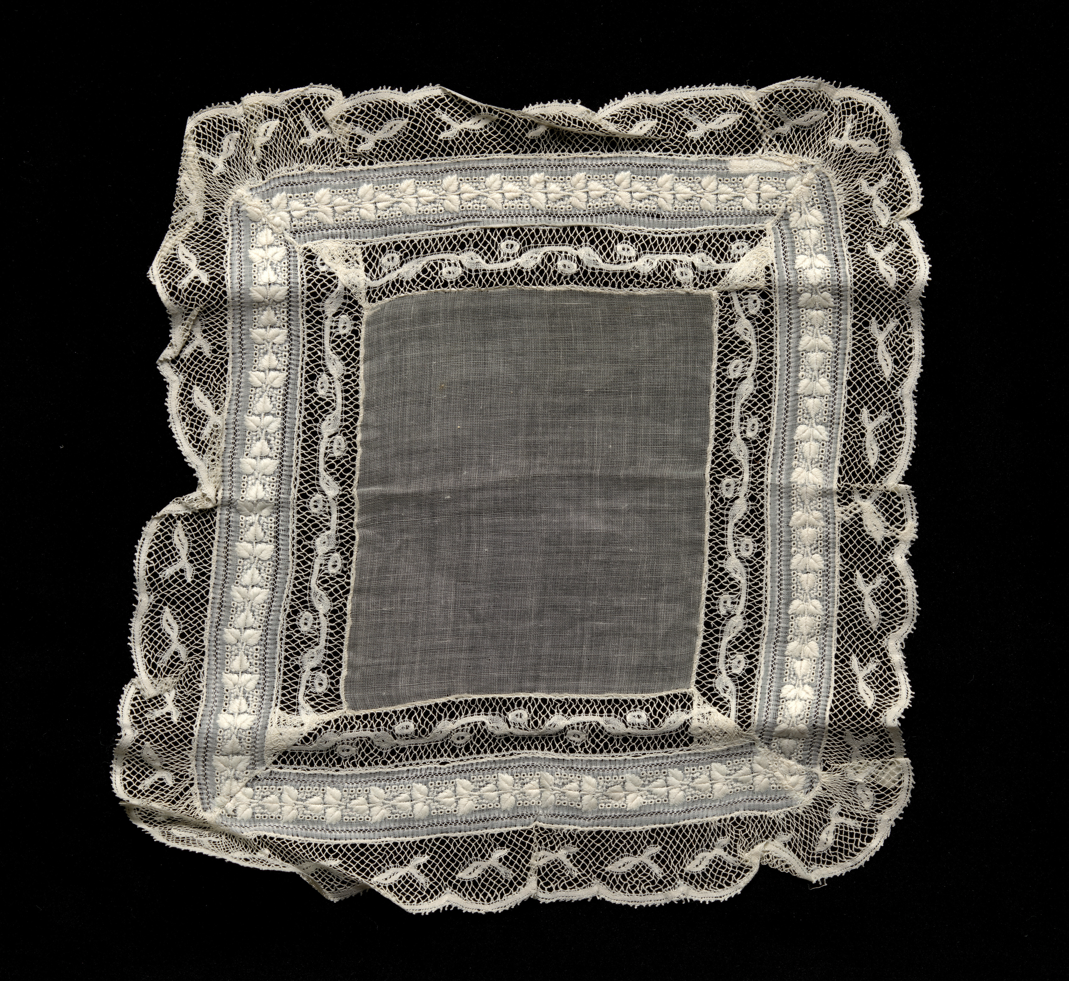 White bobbin and embroidery lace handkerchief by unknown artist. The handkerchief is square with a large central square section of semi-sheer fabric with a plain weave. The central square section is bordered on all sides by intricate white lace. The lace is made up of floral patterns and leaves. The lace features a repeating design of curved lines and shapes. The edges of the handkerchief are scalloped. The background of the image is black. The handkerchief appears to be made of delicate fabric. The lace is ornate and densely patterned. The handkerchief has a vintage appearance.