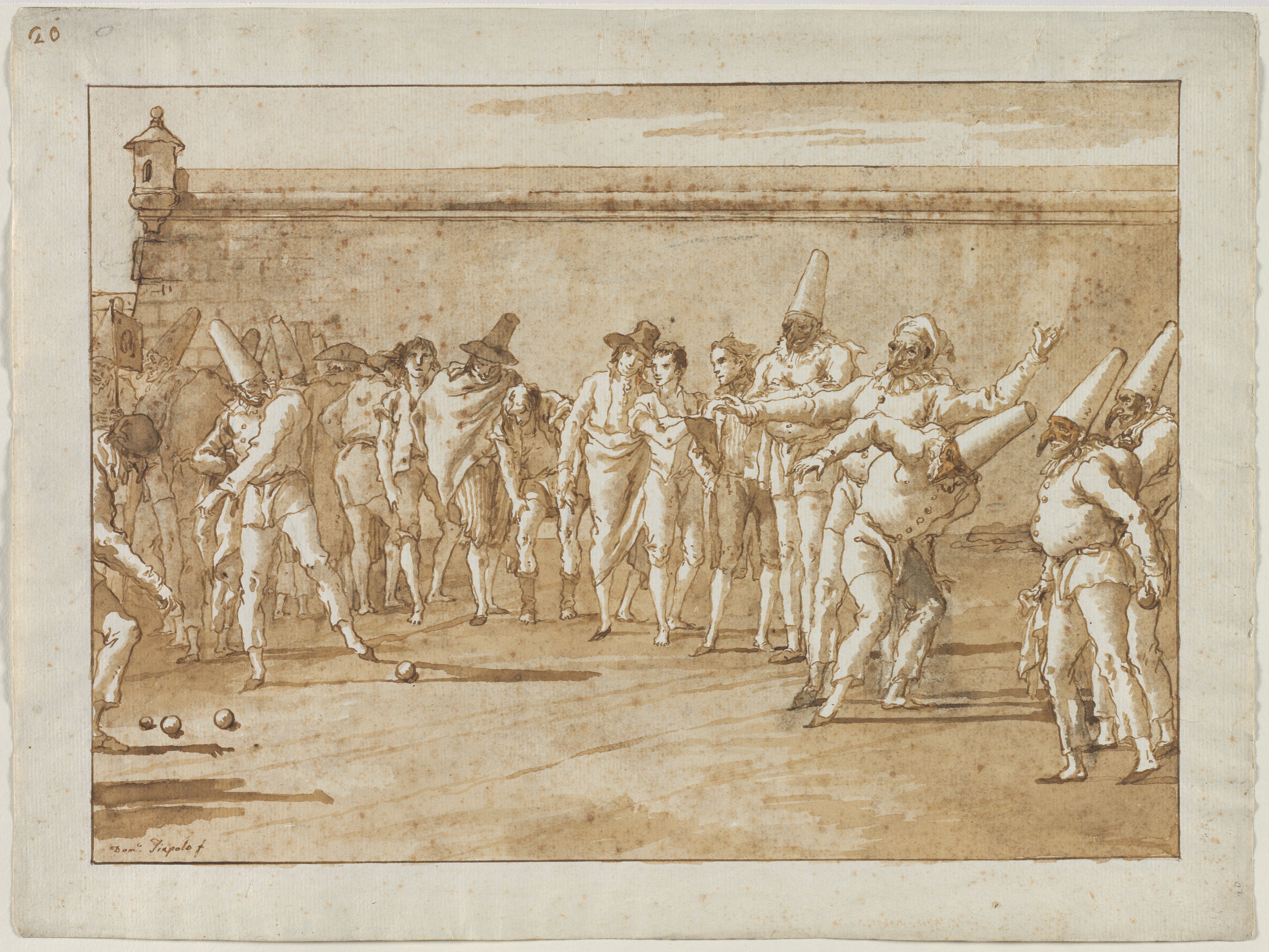 Giovanni Domenico Tiepolo's The Game of Bowls depicts a lively outdoor scene. The dominant color is sepia. Men in 18th-century attire are gathered around a game. Most are wearing hats. They are in a courtyard or plaza with a stone wall. A tower or turret is on the left side. The men are throwing balls. The balls are on the ground. The artwork is on aged paper with a rough border. The artist's signature appears at the bottom left.