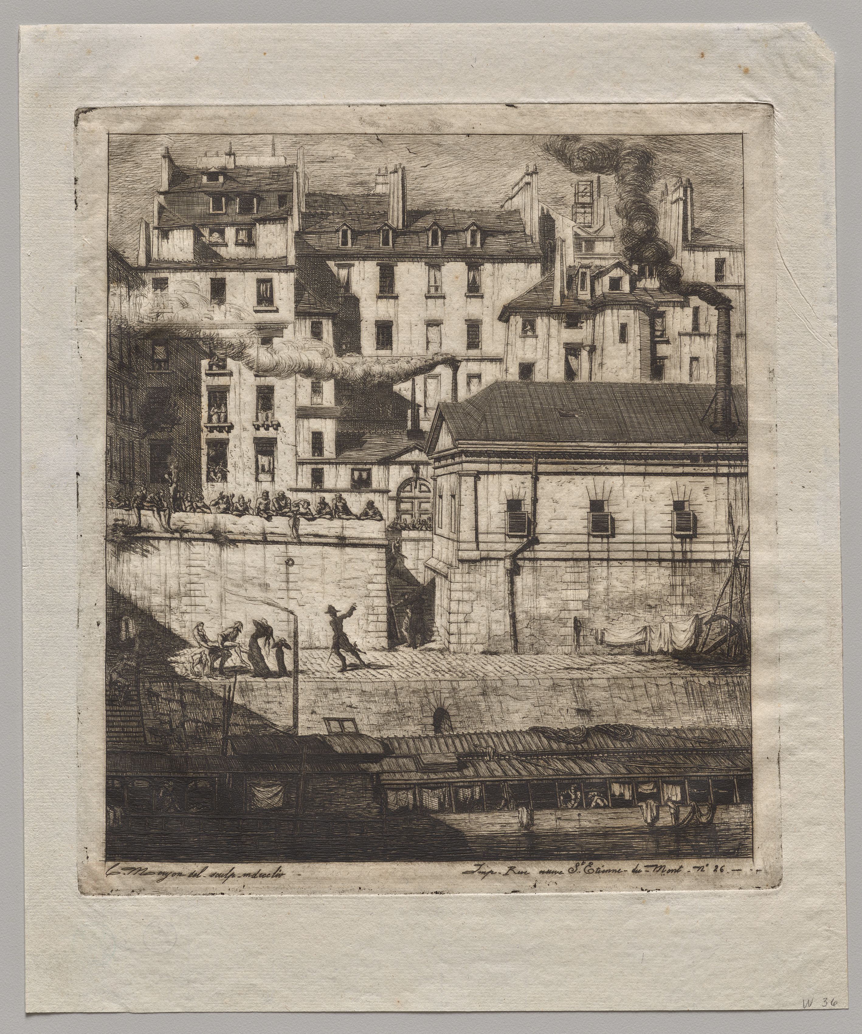 The image depicts a black and white etching of a city scene. The scene shows a large building with a tiled roof and several windows on the right side. A canal or river runs along the bottom of the image, with a bridge spanning it. On the left side of the image, there are several buildings stacked on top of each other, with smoke coming out of their chimneys. Several people are standing on a wall overlooking the canal, and a few people are on the bridge or near the water. The sky is cloudy. The etching is on a piece of off-white paper with a rough texture. There is writing at the bottom of the etching but it is illegible.