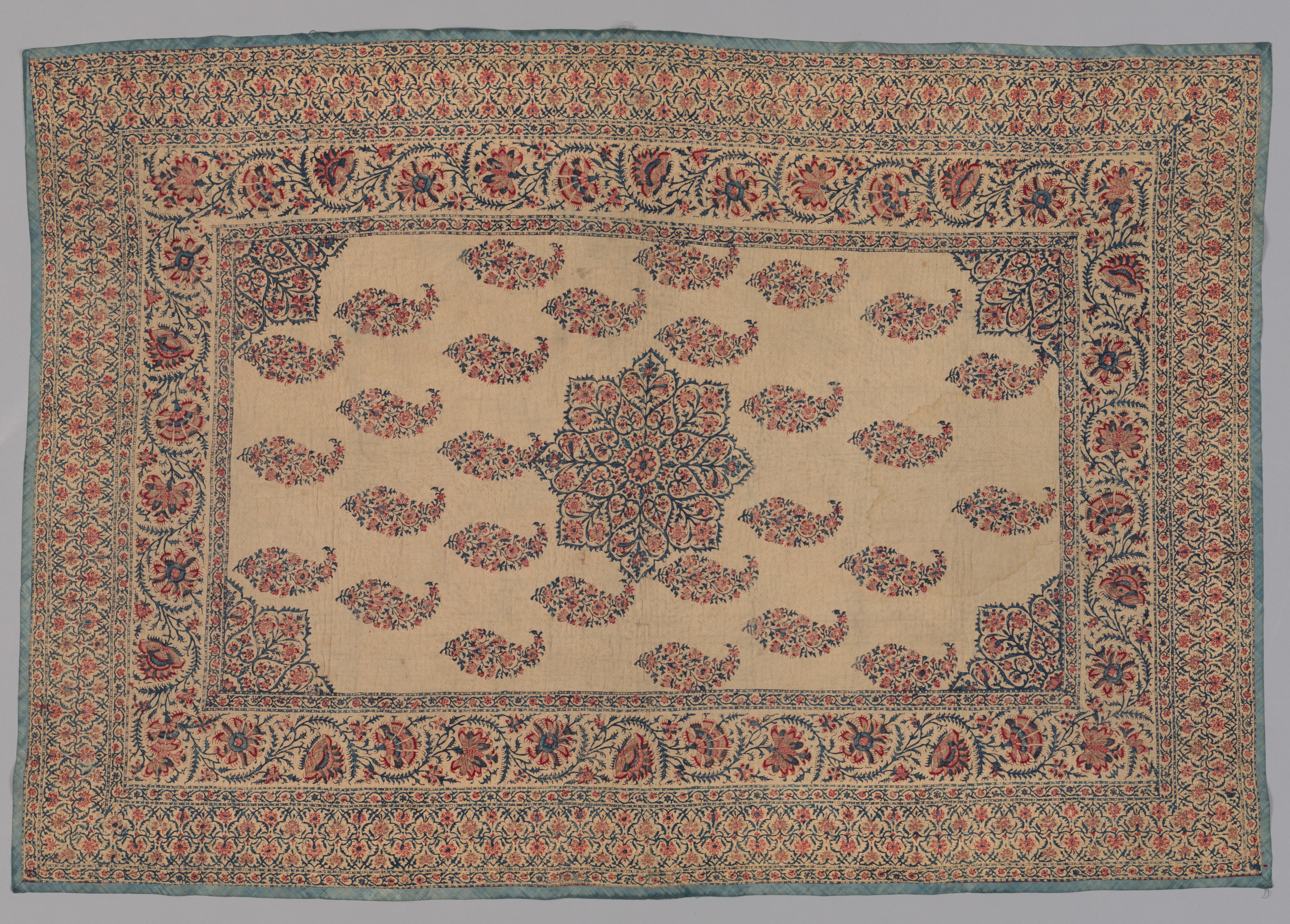 The Prayer Mat by an unknown artist features a rectangular rug with a beige background. The rug has a large central floral design in blue and red, surrounded by 20 smaller floral motifs. A thick border surrounds the central design, featuring a repeating floral pattern in blue, red, and beige. The outer border of the rug is also decorated with a floral pattern in blue, red, and beige. The rug's edges are slightly frayed and have a greenish-blue color. The background of the image is gray.