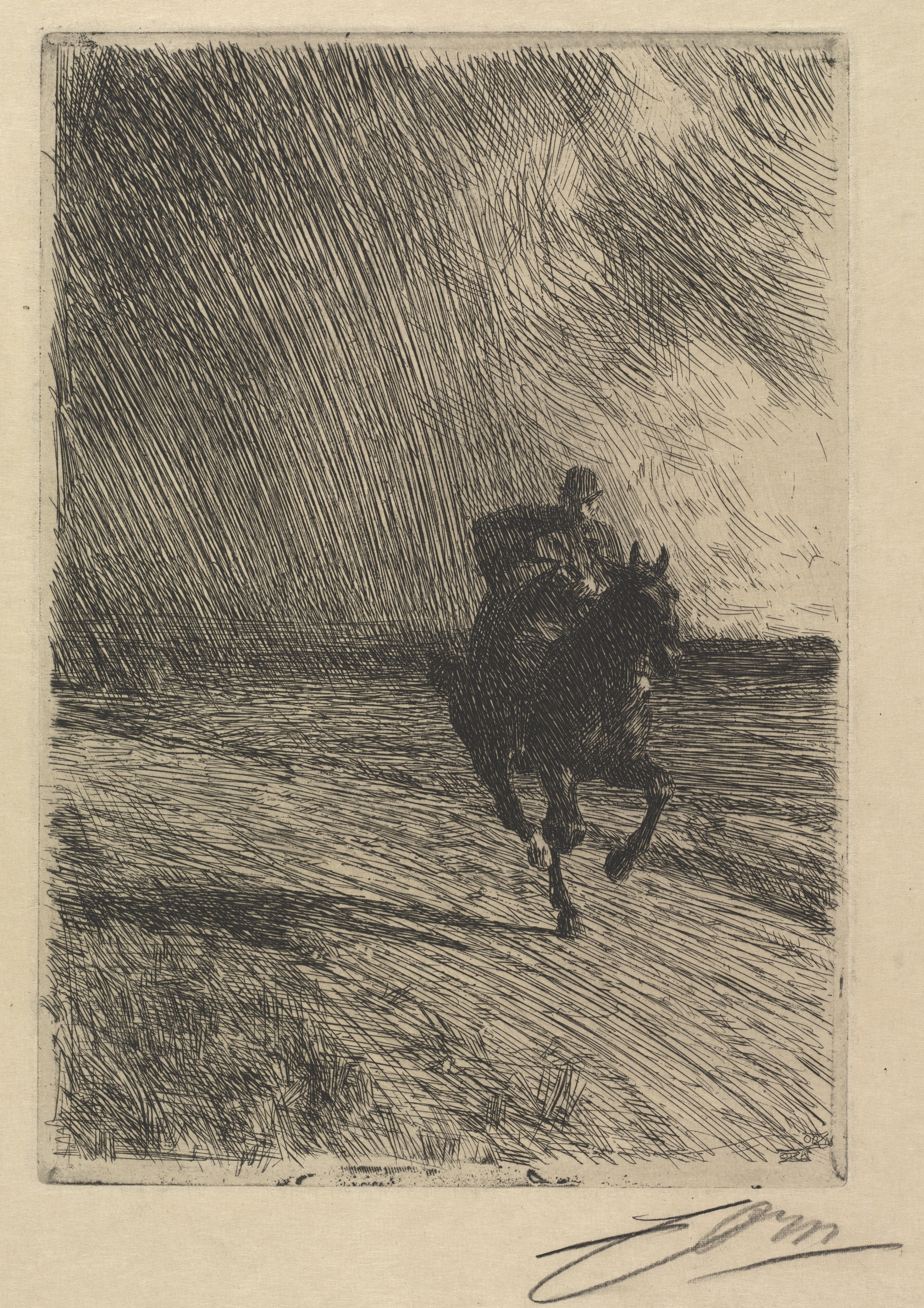 Black and white sketch of a man riding a horse. The man and horse are centered. The man wears a hat. The background is a stormy sky with rain. The artwork is signed in the bottom right corner. The title is "Storm" and the artist is Anders Zorn.