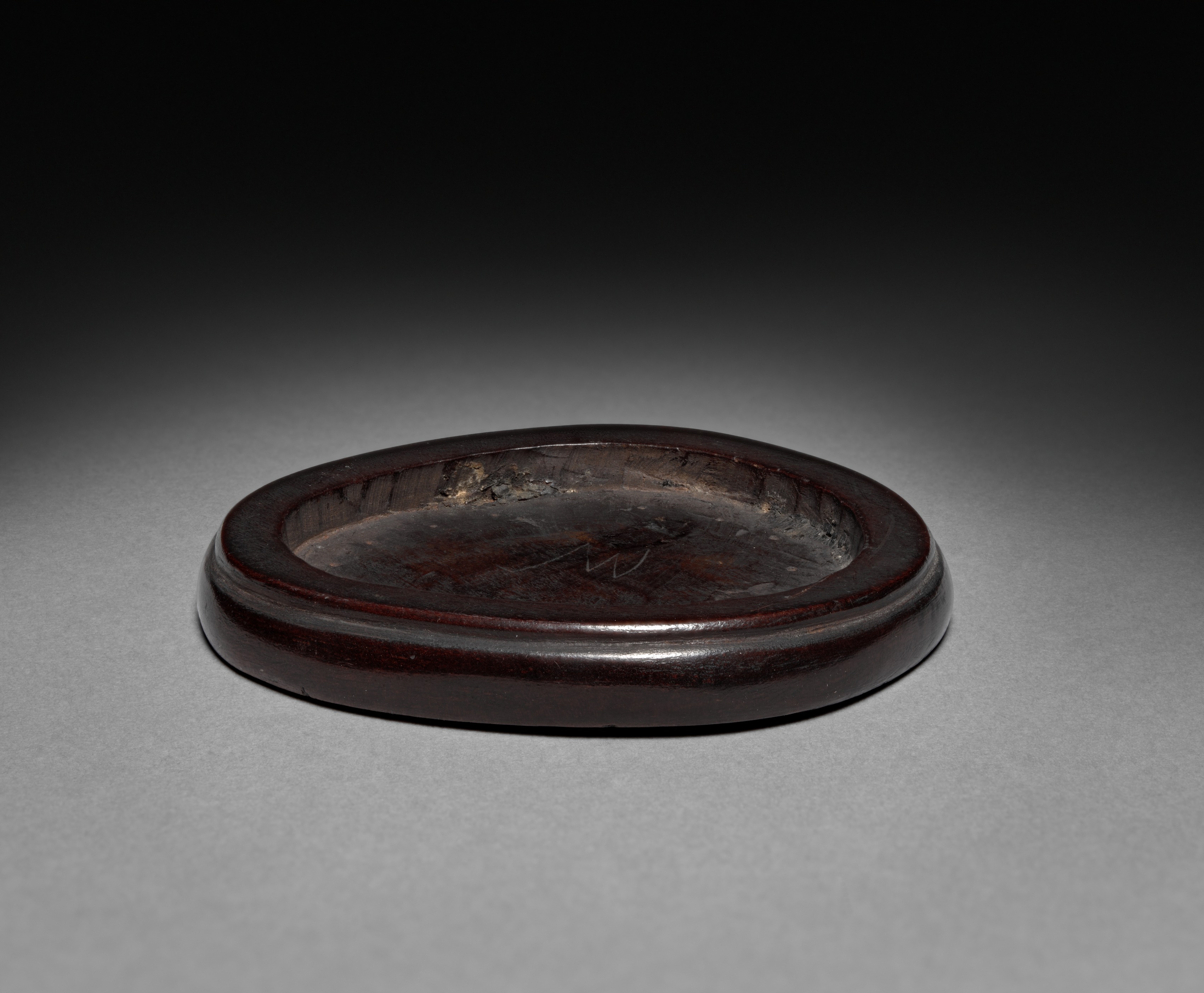 Dark brown, circular base with a raised edge. The base has a recessed area in the center with a darker brown and lighter brown coloration, and some lighter-colored spots or marks. The base appears to be made of wood and has a smooth, glossy finish. The background is gray, with a gradient that gets darker towards the top. A white vertical band is on the right side.
