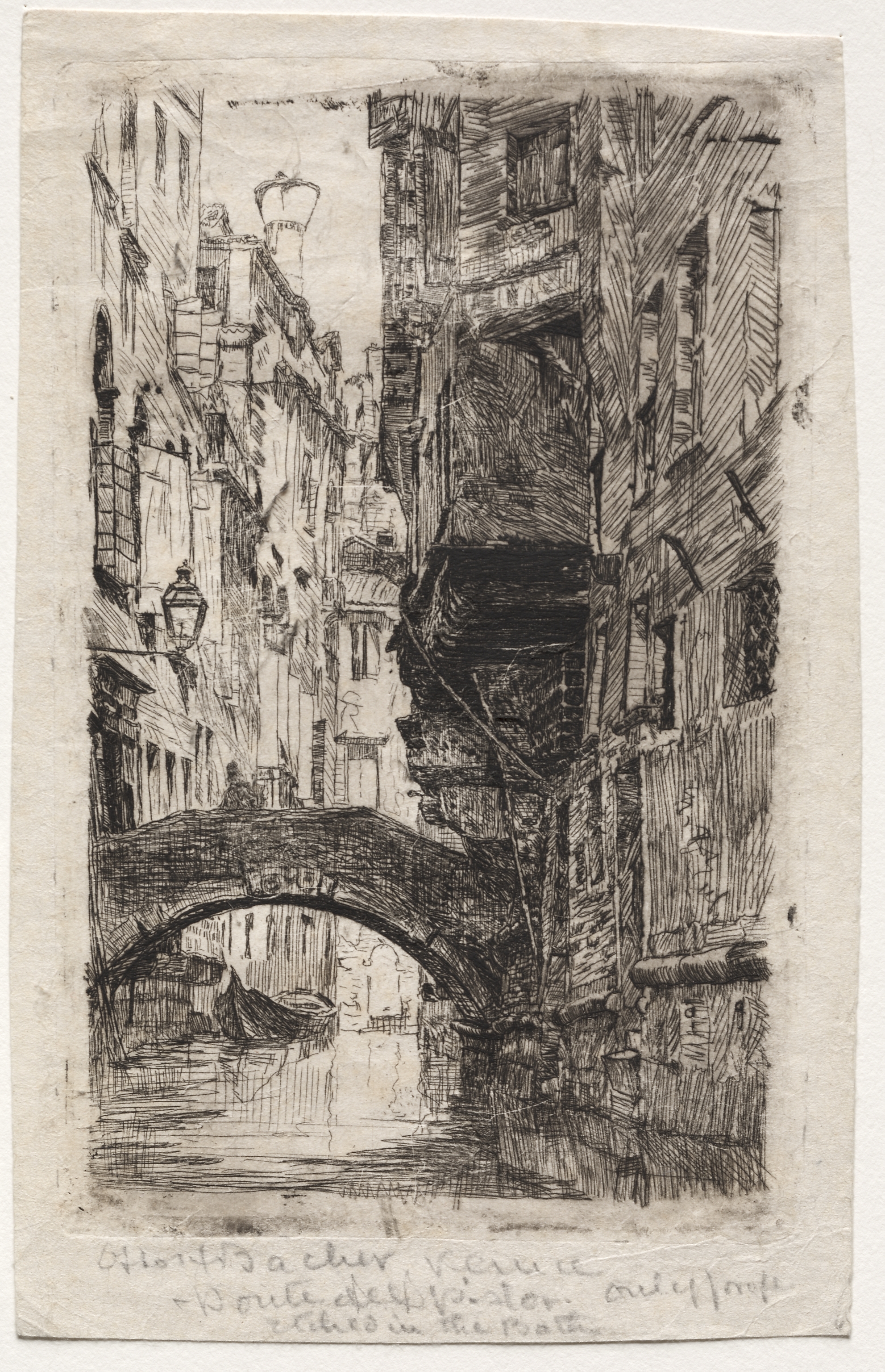 Black and white sketch of a canal scene. A small stone bridge spans the canal. A gondola floats beneath the bridge. The bridge and gondola are in the lower half. The buildings on both sides of the canal appear to be several stories tall and made of stone, brick, or stucco. Some have small windows and balconies. A lantern-style light fixture hangs from a building on the left. The water in the canal reflects the dark shading of the buildings. The artwork appears to be drawn on aged paper with a rough texture. The image depicts "Ponte del Pistor" by Otto H. Bacher.