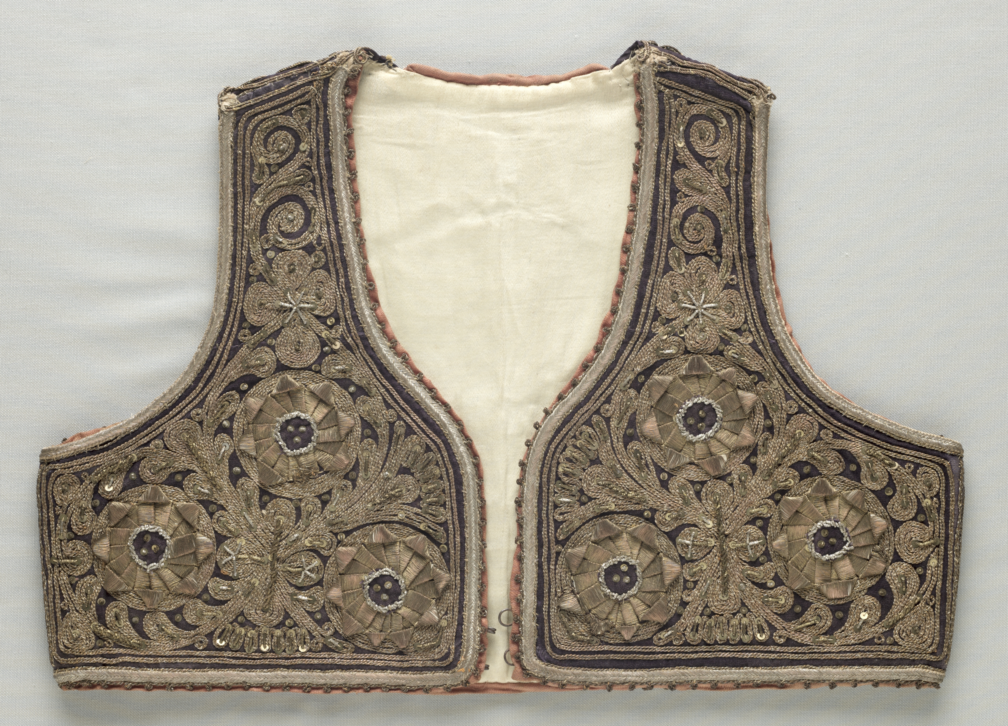 The vest "Vest" by the artist is a sleeveless garment with a U-shaped neckline and no fastenings visible. The exterior is primarily black with intricate gold embroidery covering most of its surface. The embroidery features floral patterns and rosettes. The interior lining is cream-colored fabric. The vest has a curved shape at the bottom and appears to be made of a fabric with a smooth texture. The background of the image is a light-colored fabric surface.