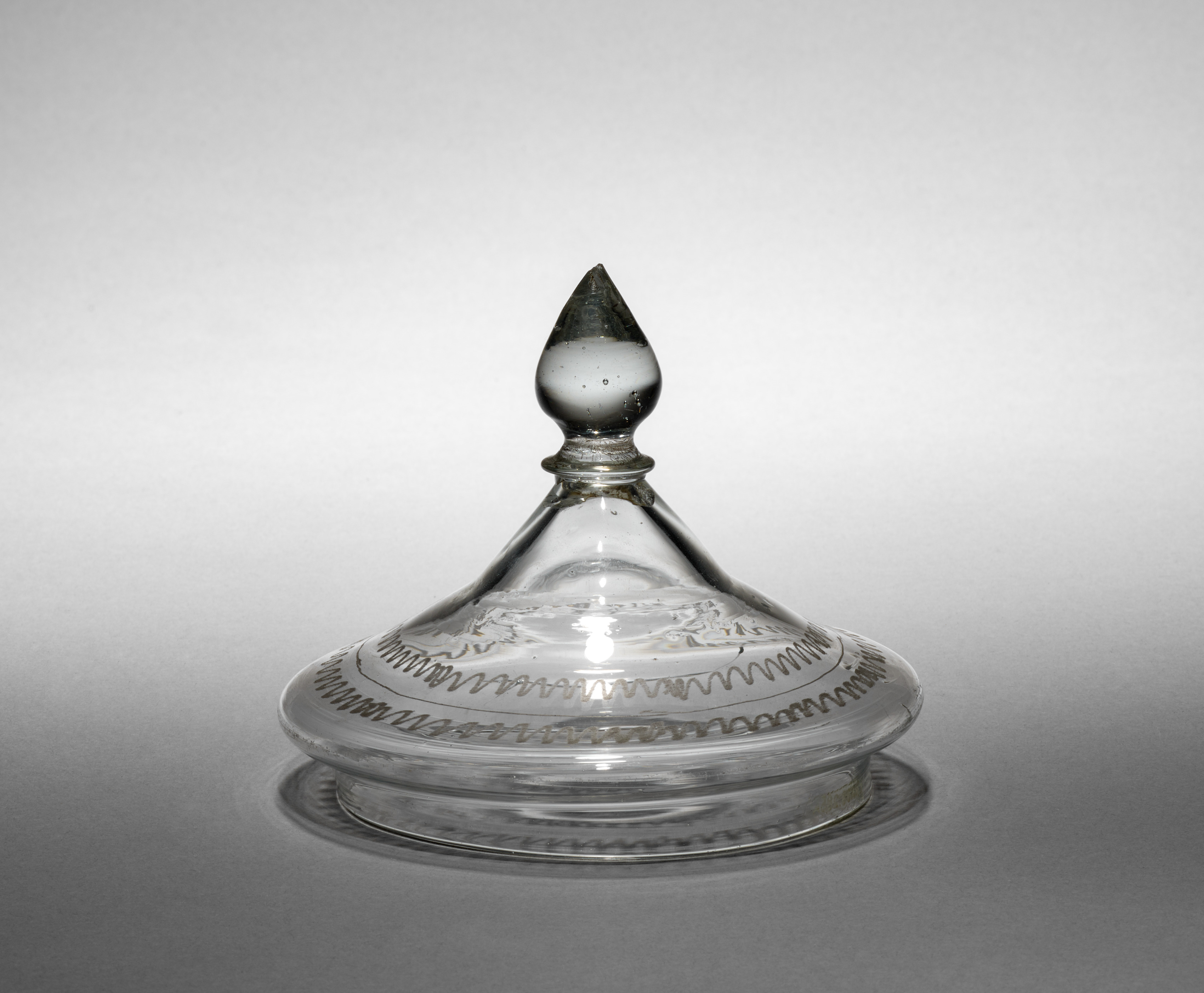 Clear glass lid with a pointed finial on top. The lid is dome-shaped and has a wide base. There are two etched decorative bands around the lid; one near the base and one near the top. The lid sits on a reflective surface with a gradient gray background. The artist and title of the piece is Flip Glass (lid).
