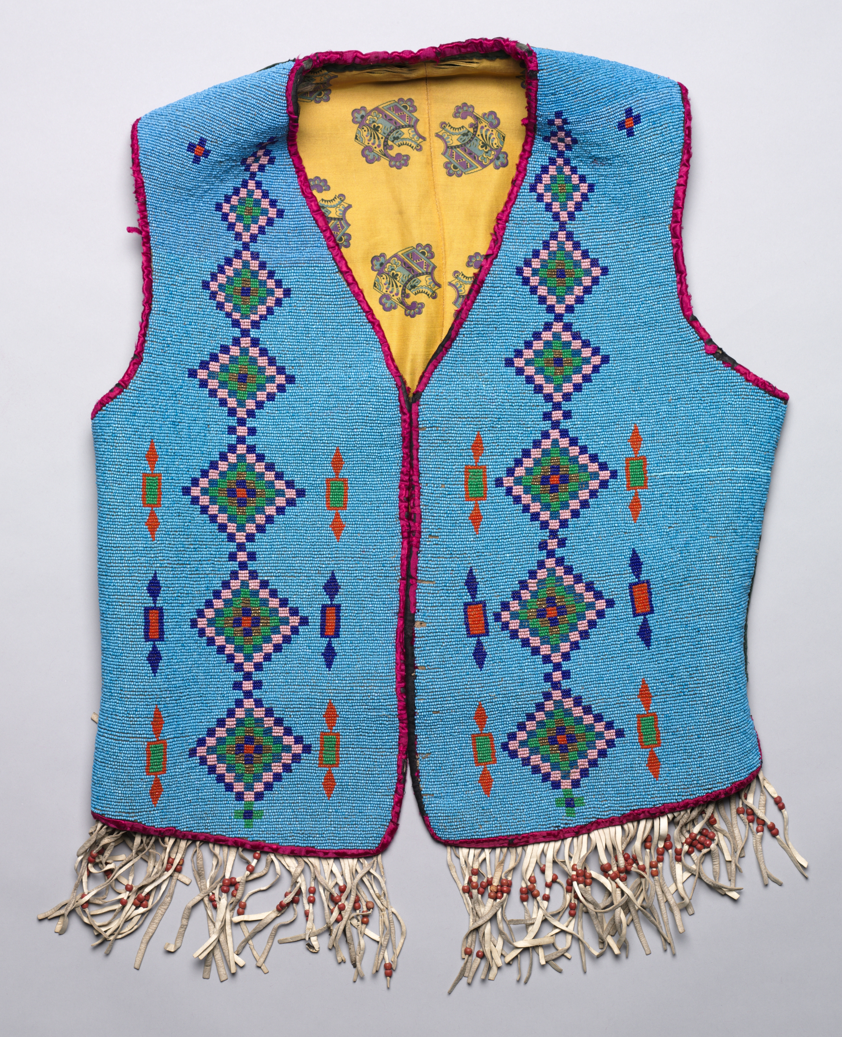 Beaded vest with a light blue exterior and a yellow interior. The exterior features a geometric pattern with diamond shapes in shades of blue, green, orange, and pink. The vest has a pink trim and tassels at the bottom. The interior lining has a repeating pattern of purple flowers on a yellow background. The vest is laid flat on a white surface.