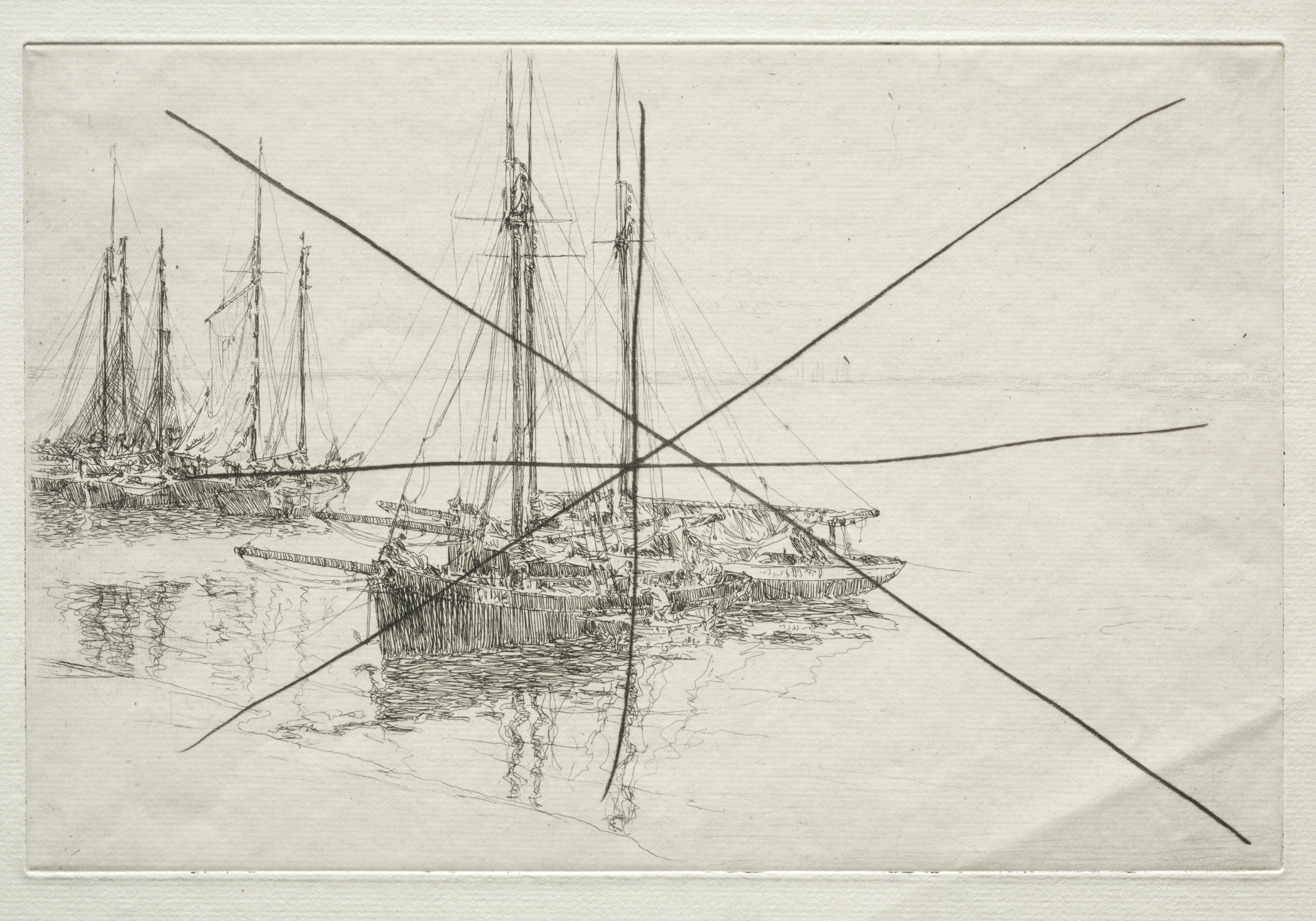 The image features a black and white drawing of boats on water. The boats are depicted with multiple masts and rigging. Two boats are prominently shown in the foreground and one to the left in the background. The boat in the center has a tall mast with multiple ropes and lines. The water is calm, reflecting the boats and their masts. The drawing is on a textured surface, likely paper, with a rough edge around the border. The overall scene shows a serene and peaceful atmosphere. The drawing is titled "Oyster Dredgers" by Arthur John Trevor Briscoe.