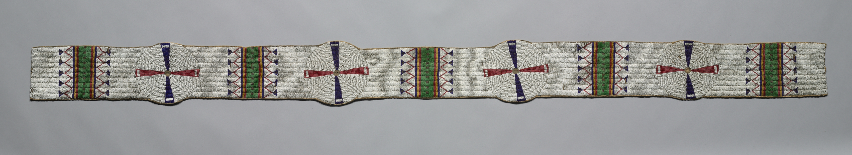 The image depicts "Blanket Strip" by an unknown artist. The object is long and rectangular with wavy edges. It has a white background made of tightly packed rows of white beads. The object features repeating patterns consisting of green, red, and blue elements. The patterns include green vertical rectangles with an orange border on either side. There are also red and blue shapes resembling a bow or a cross with a yellow center. The blue and red shapes are outlined in white beads. The object is centered on a gray background.