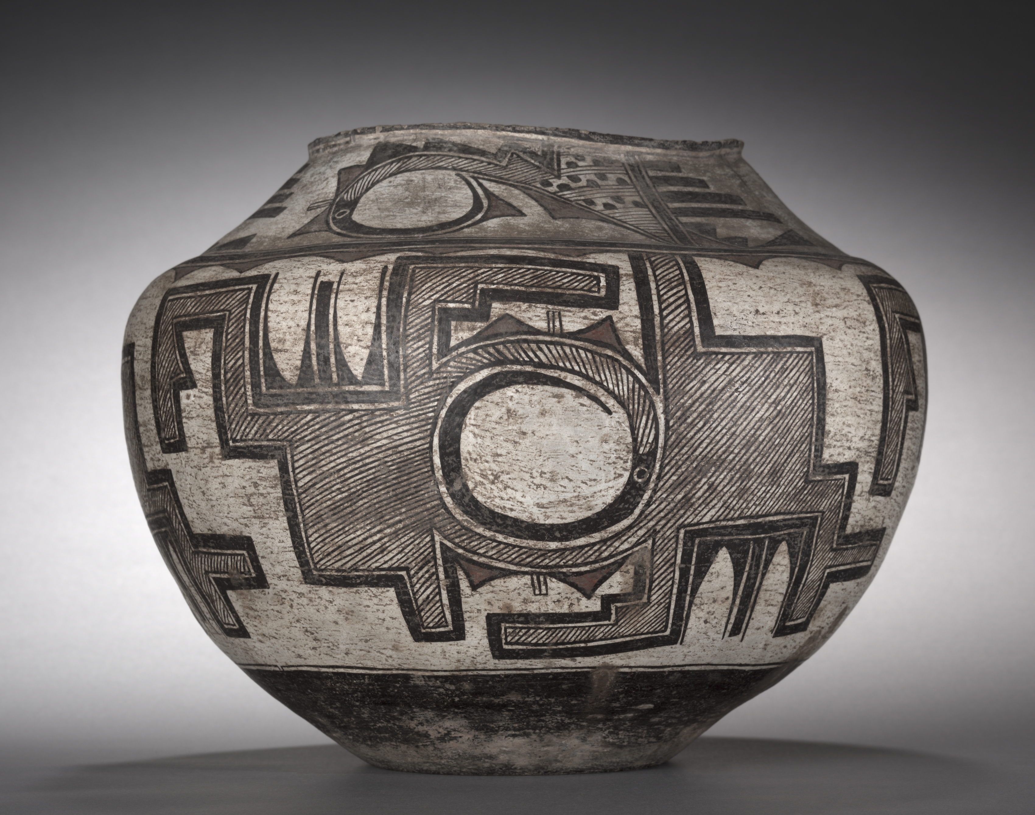 The image depicts a ceramic water jar, also referred to as an olla, featuring a rainbird design. The jar's body is predominantly white with a black base. The geometric design on the jar showcases black and white patterns. A notable design element on the jar is a stylized bird motif situated beneath the lip. A large circle surrounded by geometric shapes dominates the central area of the jar. The background of the image gradates from dark gray at the top to light gray towards the center.