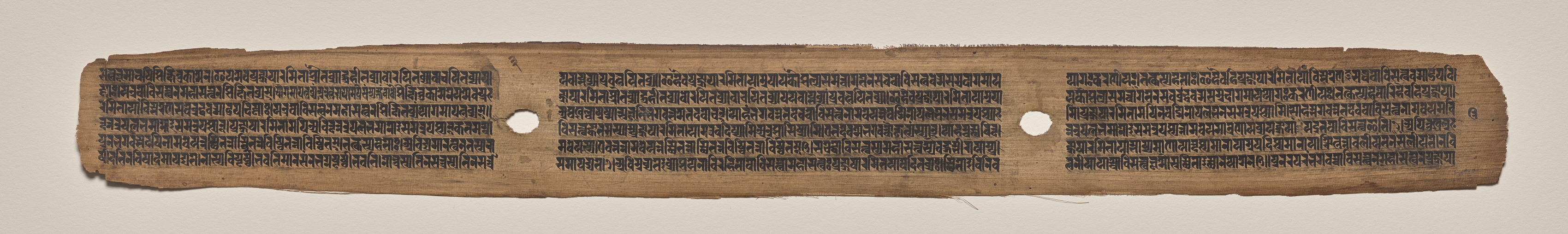 The image shows a long, narrow, brown, rectangular piece of paper or parchment with rough edges. The paper is divided into three sections by two oval holes. Each section contains many lines of small, black text written in a language that appears to be an ancient script. The text is arranged in horizontal lines, with each line consisting of multiple words or characters. The background of the image is a plain beige color. The overall appearance suggests an ancient manuscript or scroll.