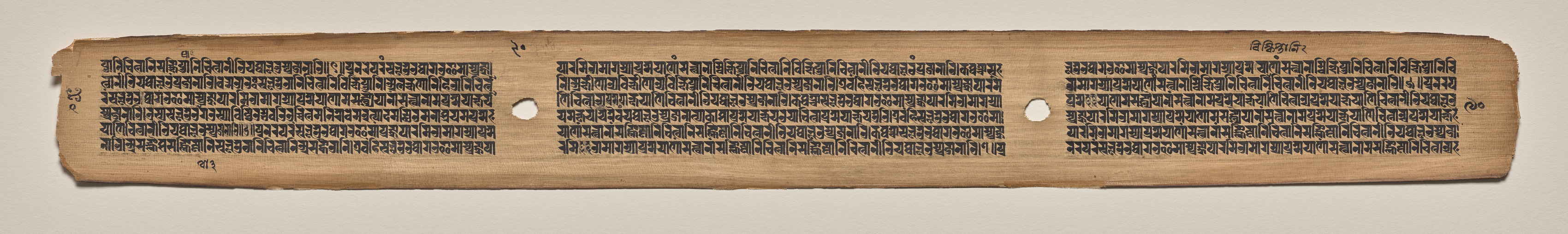 Long, narrow, light brown rectangular piece of paper or parchment with rough edges. Two holes are present in the center, aligned vertically. The surface contains dense rows of small, black, uniform script written in a language that appears to be an ancient or classical form of writing, likely in a single column on each side of the holes, with the text continuing to the edges without interruption. The background behind the paper or parchment is a plain light gray color.
