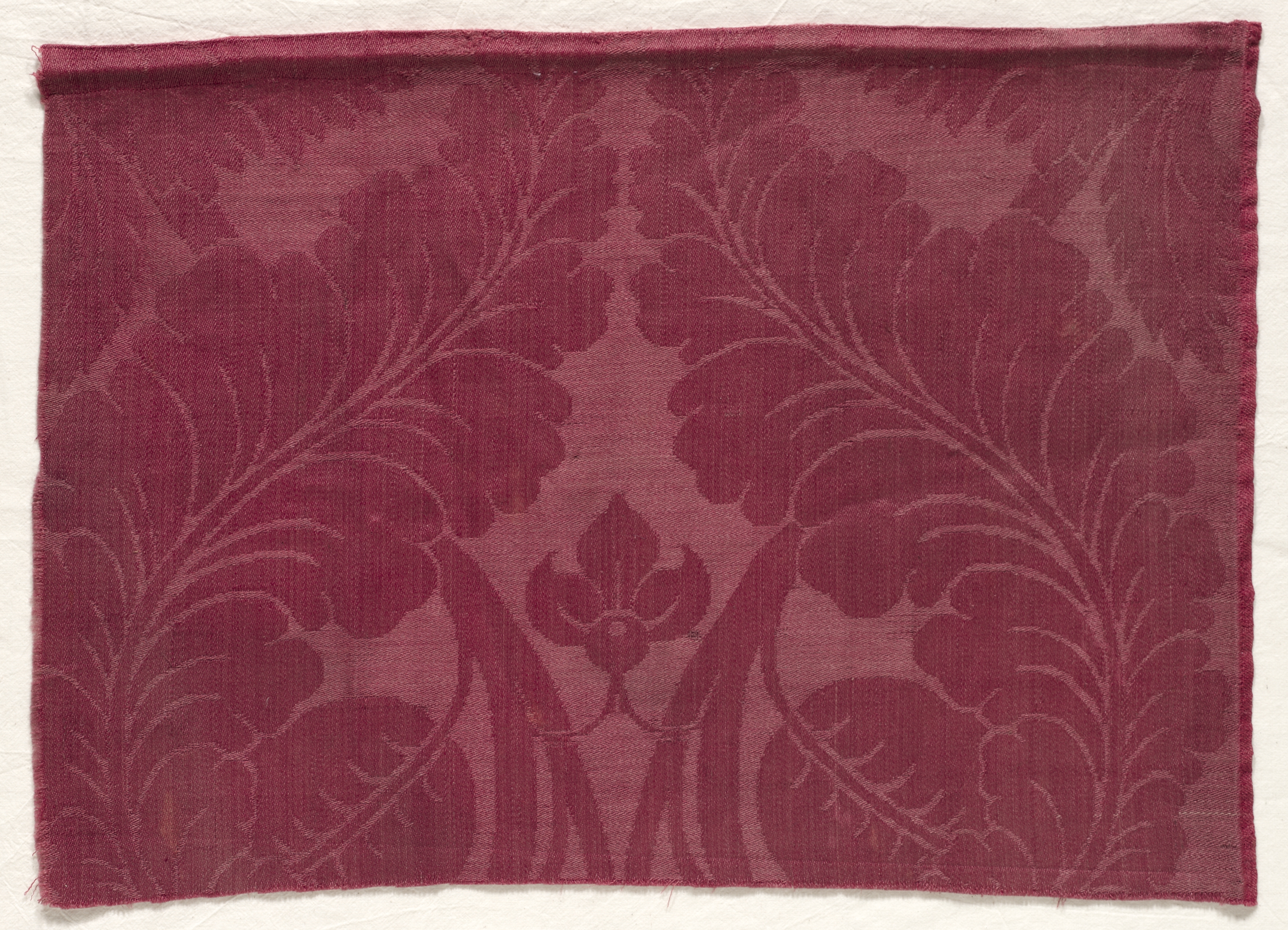 The Damask with Leaf and Floral Design by artist is a rectangular piece of fabric with a maroon color. The fabric features a repeating pattern of leaves and flowers in a lighter shade of maroon. The top edge of the fabric is folded over, while the other edges are raw and unhemmed. The background behind the fabric is white. The pattern on the fabric includes large leaves with pointed tips and stems that connect to flowers or other leaves. The leaves and flowers are arranged symmetrically across the fabric.