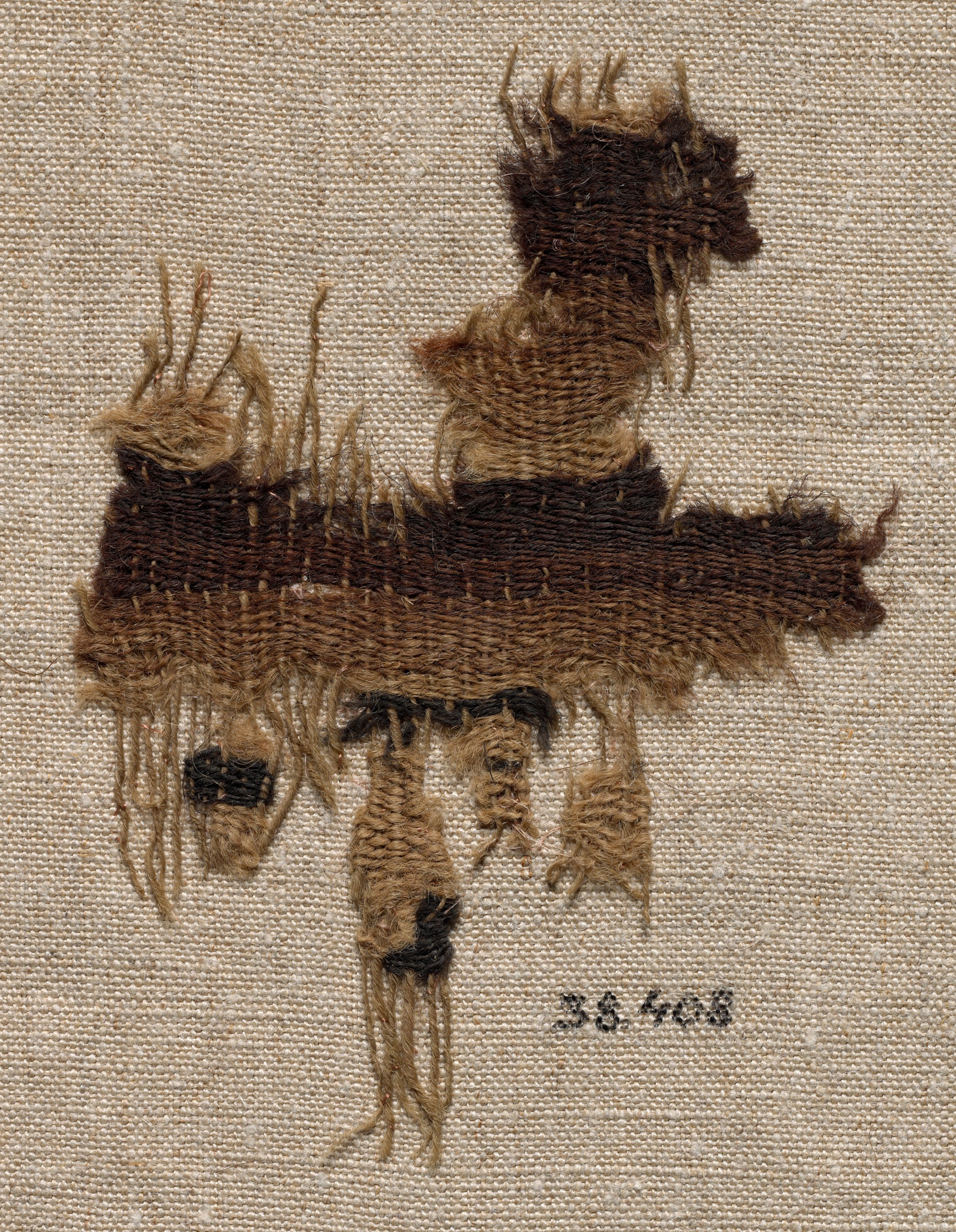 Wool Fragment by Ananda Kentish Coomaraswamy. The image shows an old, frayed textile fragment on a beige background. The fragment is made of brown and tan-colored wool threads and appears to be a woven piece with a rough, unfinished texture. The edges are frayed and uneven, with some threads hanging loose. The fragment is roughly rectangular in shape but has an irregular form with a protrusion at the top and extensions on the bottom resembling legs. The background is a plain beige fabric with a visible weave pattern. A small handwritten number "35.408" is visible at the bottom.