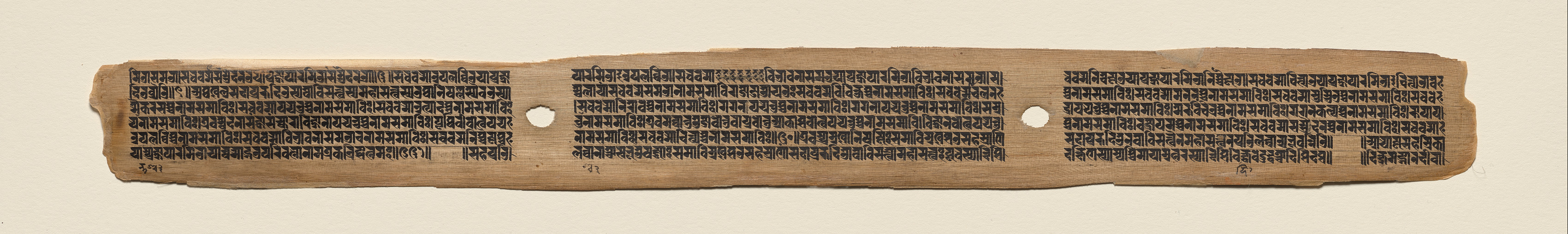 A long, narrow, horizontal piece of aged, light brown paper with uneven edges. The paper has two holes, one near the center and one to the right of center. The surface of the paper contains many lines of small, black, written text. The text is arranged in three columns with a hole in the center of each column. The background behind the paper is a solid, light beige color.