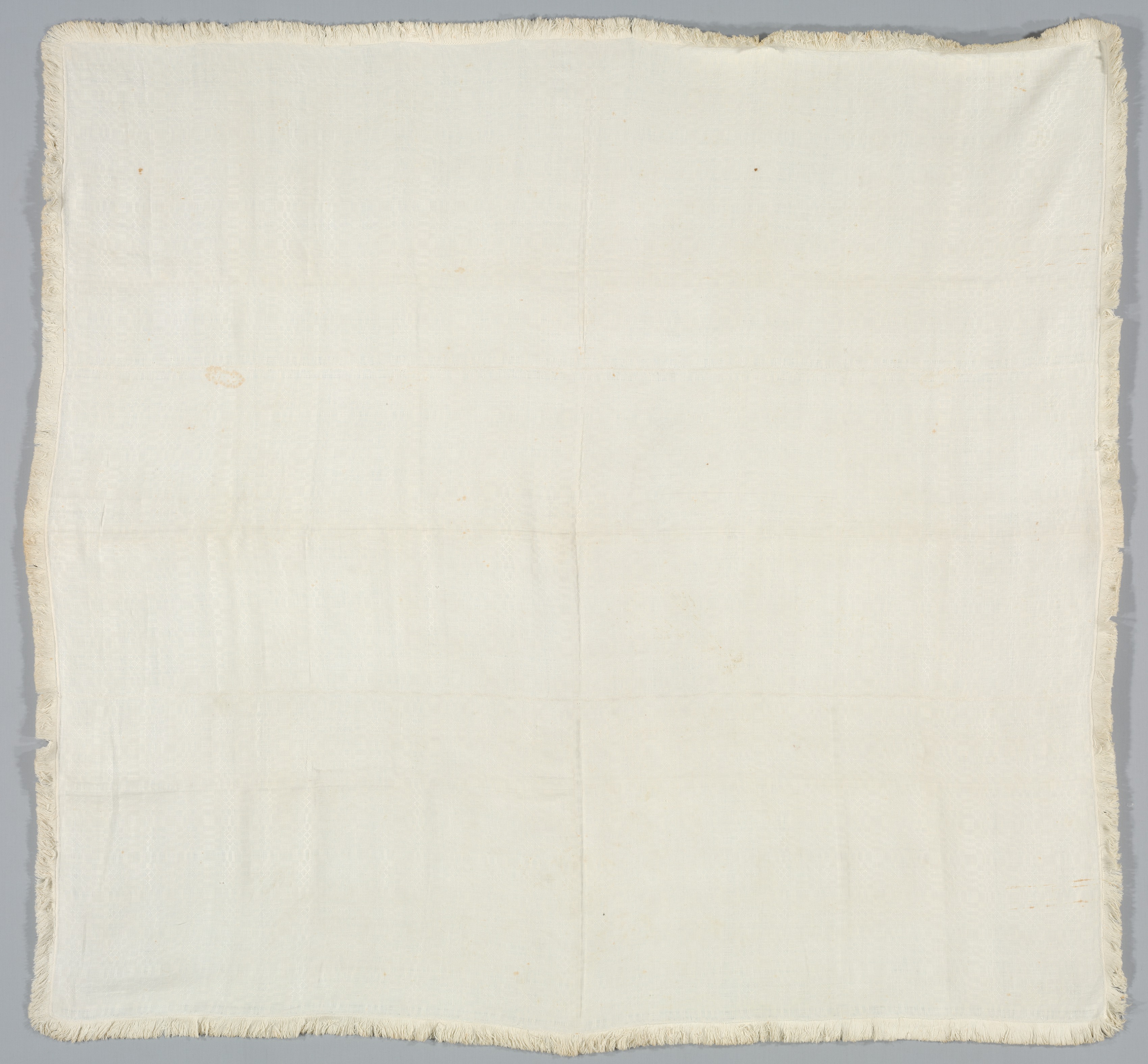 Tablecloth by artist unknown. The image shows a square piece of white fabric with fringed edges. The fabric appears to be made of a lightweight material, possibly cotton or linen. It has a few small stains and some wrinkles, giving it a slightly aged appearance. The fringed edges are uneven and rough, with some threads hanging loose. The background of the image is a plain gray color, which helps to highlight the texture and details of the fabric. The fabric is laid flat and appears to be a tablecloth.