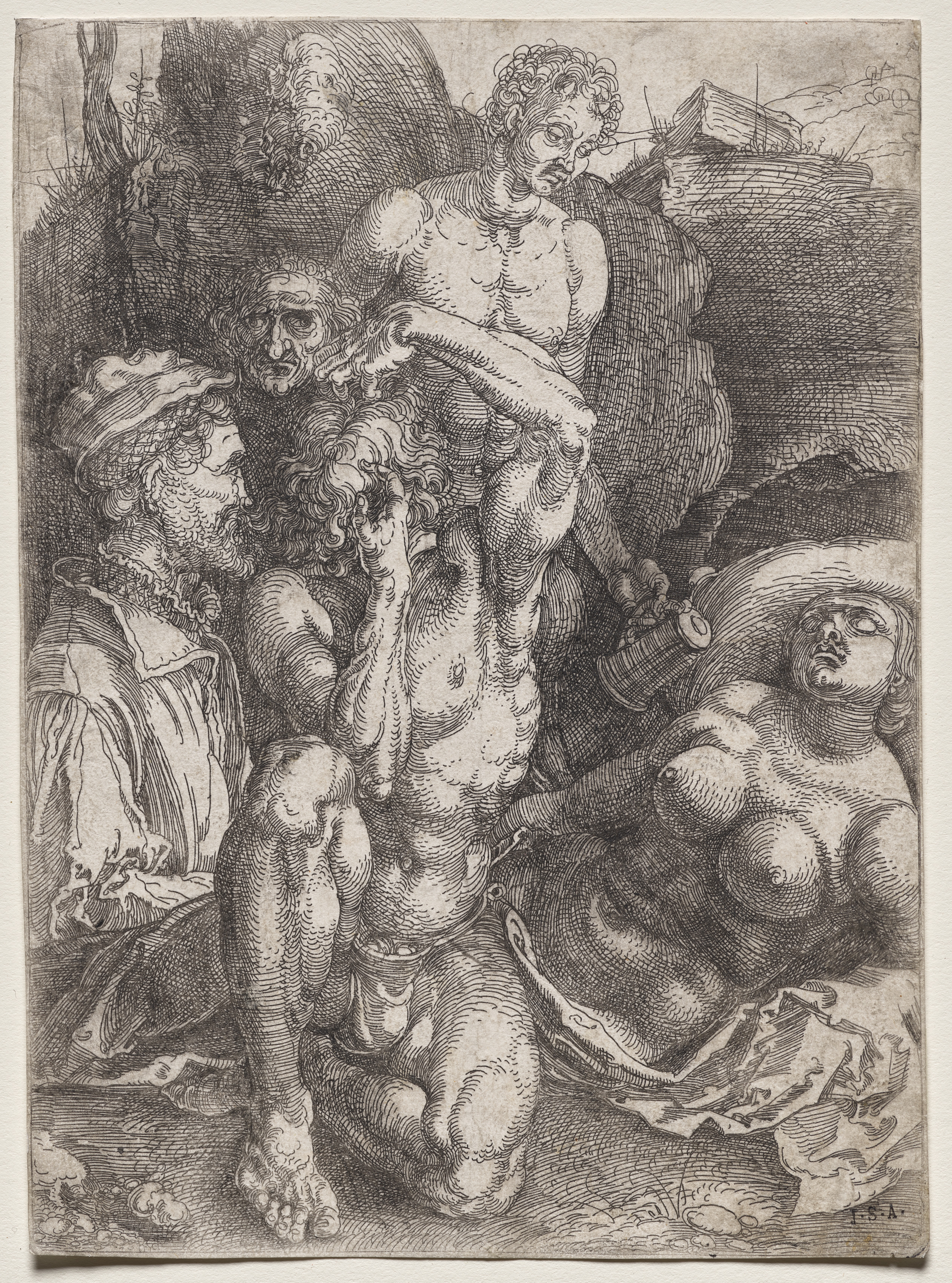 Black and white drawing of five figures. The figure on the left is an older man with curly hair wearing a head covering, robe, and shoes. The figure behind him is an older man with a beard wearing a hat. The figure in the center is a nude man on one knee with his head down. The figure above him is a muscular nude man with curly hair. The figure on the right is a nude woman on her back wearing a hat. The background includes a tree, a rocky cliff, and a building. The drawing style includes detailed lines and shading.