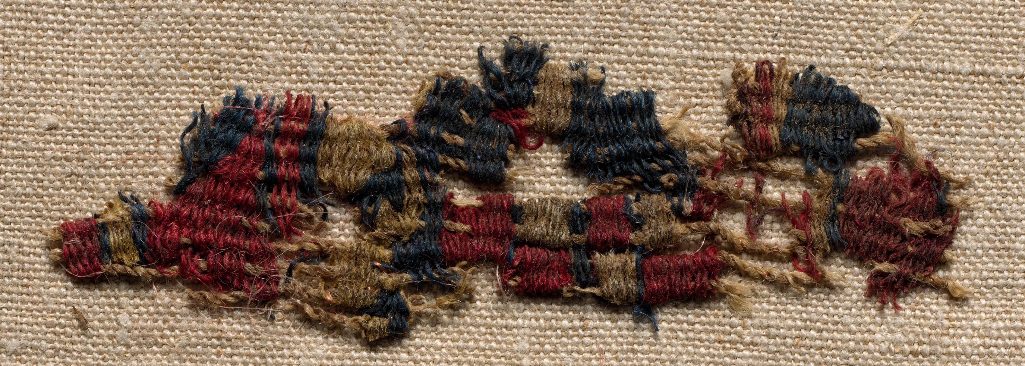 Wool Fragment by Unknown Artist. The image shows a close-up of a textile fragment with frayed edges. The fragment consists of several strips of woven material in red, blue, and tan colors, arranged horizontally across the center of the image. The strips are woven together with loose threads. The background is a light beige fabric with a visible weave pattern. The fabric appears to be a natural fiber such as wool or cotton. The overall appearance of the fragment suggests it is an old or antique piece of textile. The colors have faded over time. The image is well-lit, with no shadows. The background fills the entire image except for the central fragment. The fabric in the background has a uniform color and texture.