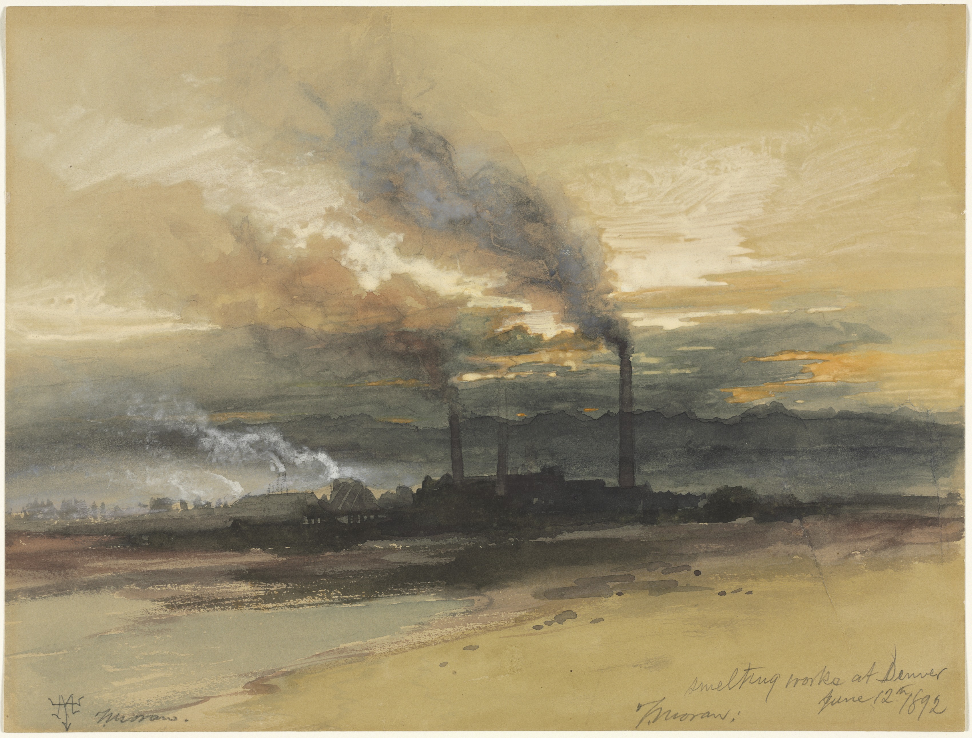 The painting depicts an industrial landscape with a factory emitting smoke from multiple chimneys. The factory is dark in color and situated on the right side of the image. Two large chimneys are prominent, with one emitting a significant amount of dark smoke that disperses into the sky. In the background, a mountain range is visible. The sky above is cloudy and illuminated by the sun, casting a warm glow on the clouds, which are shades of yellow, orange, and white. The overall color palette of the painting is muted, with earthy tones dominating the scene. The painting's color is sepia-toned with a signature in the bottom left corner and handwritten text in the bottom right corner that reads "Smelting works at Denver" and "June 12 1892".