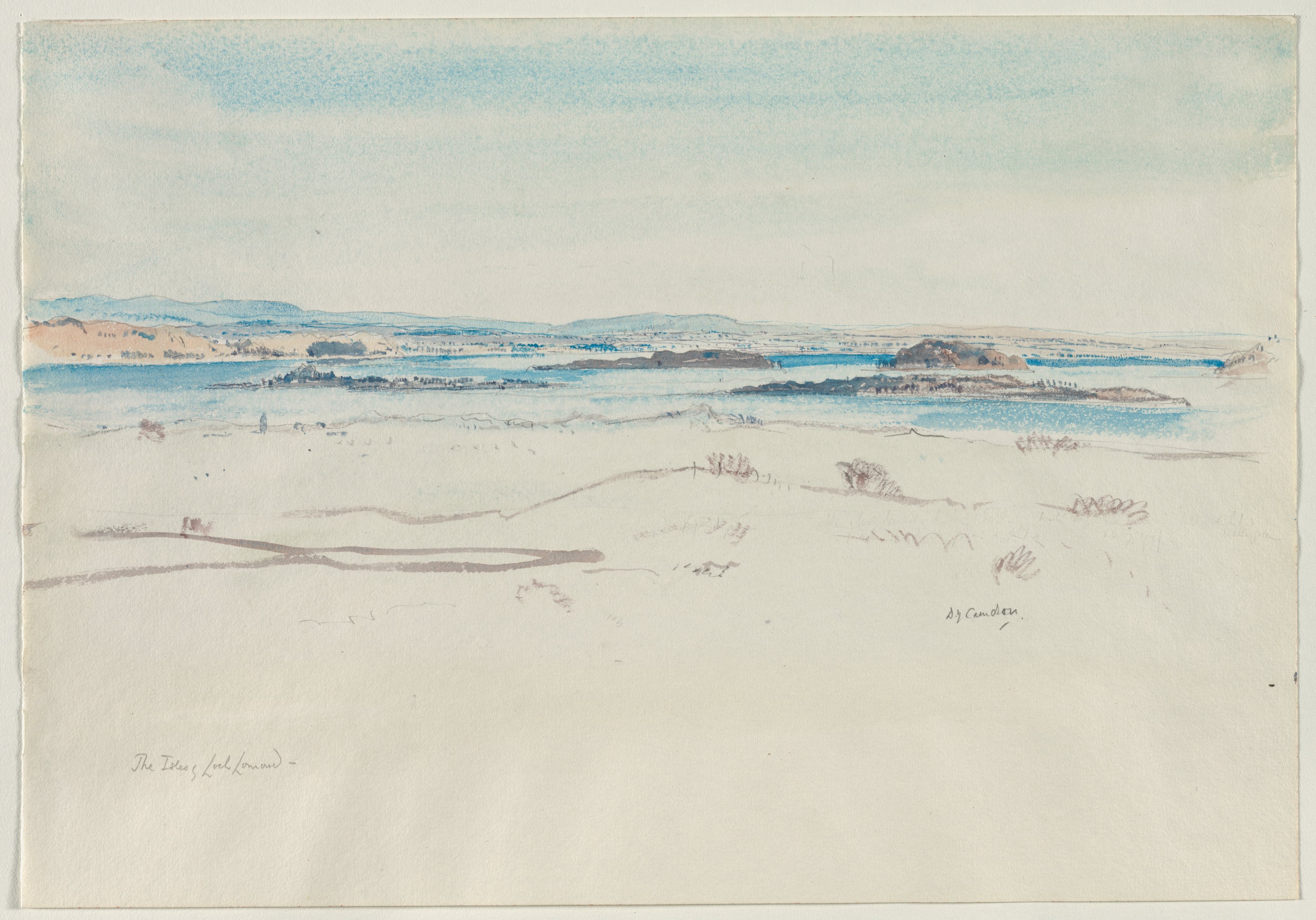 Watercolor painting of a landscape with a large body of water. The water is blue with brown and green hues. There are several small islands in the water. The foreground has light brown ground with some darker brown lines and shapes. The sky above is blue and white. The painting is signed "D.Y. Cameron" in the bottom right corner. The bottom left corner says "The Isles of Loch Lomond".