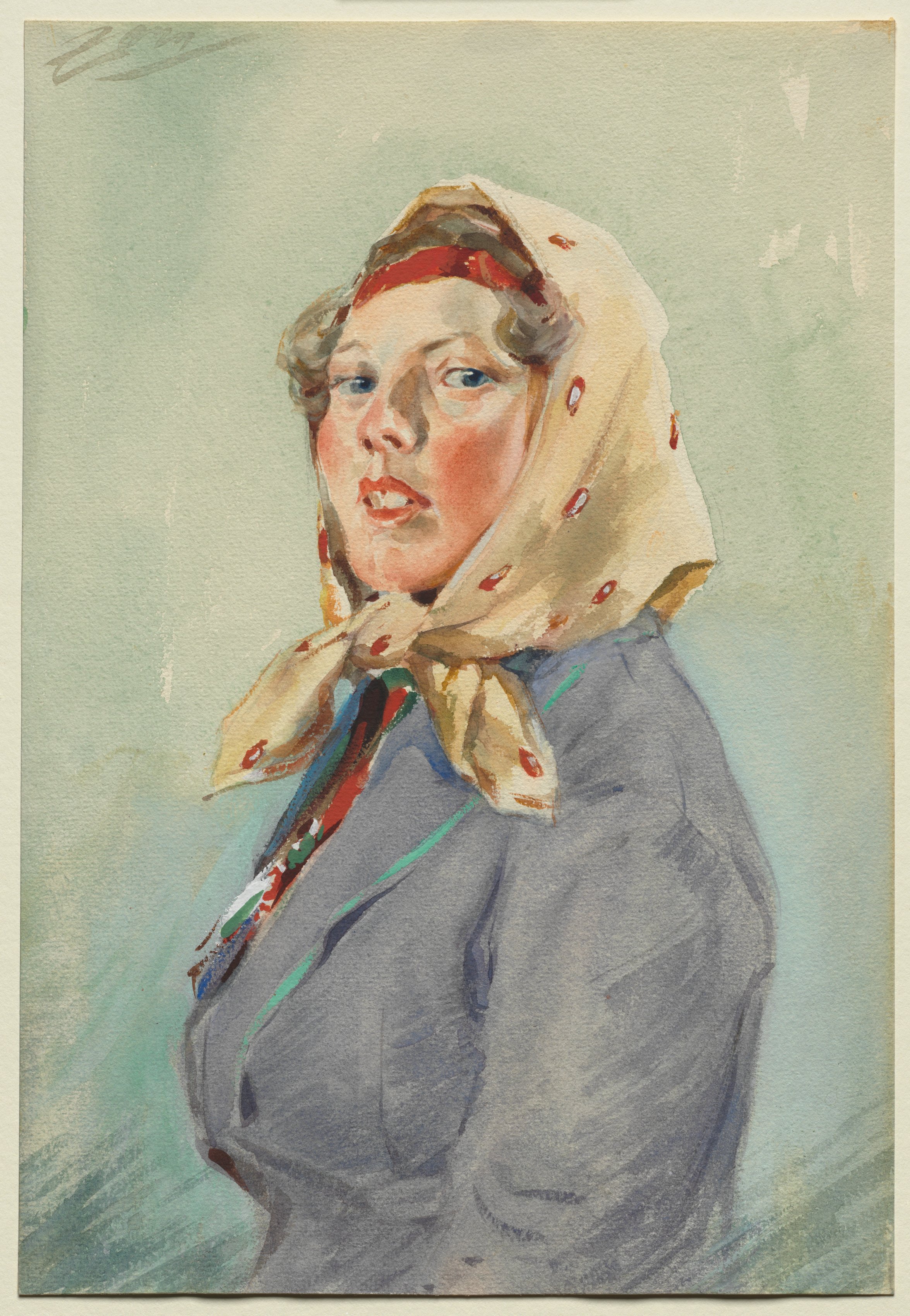 Woman with fair skin, blue eyes and short, curly brown hair. She wears a red headband, a cream-colored scarf with red spots around her head and neck, a blue shirt and a scarf with red, green and white patterns around her neck. The background is greenish-gray. The painting style is realistic. Skerikulla by Anders Zorn.