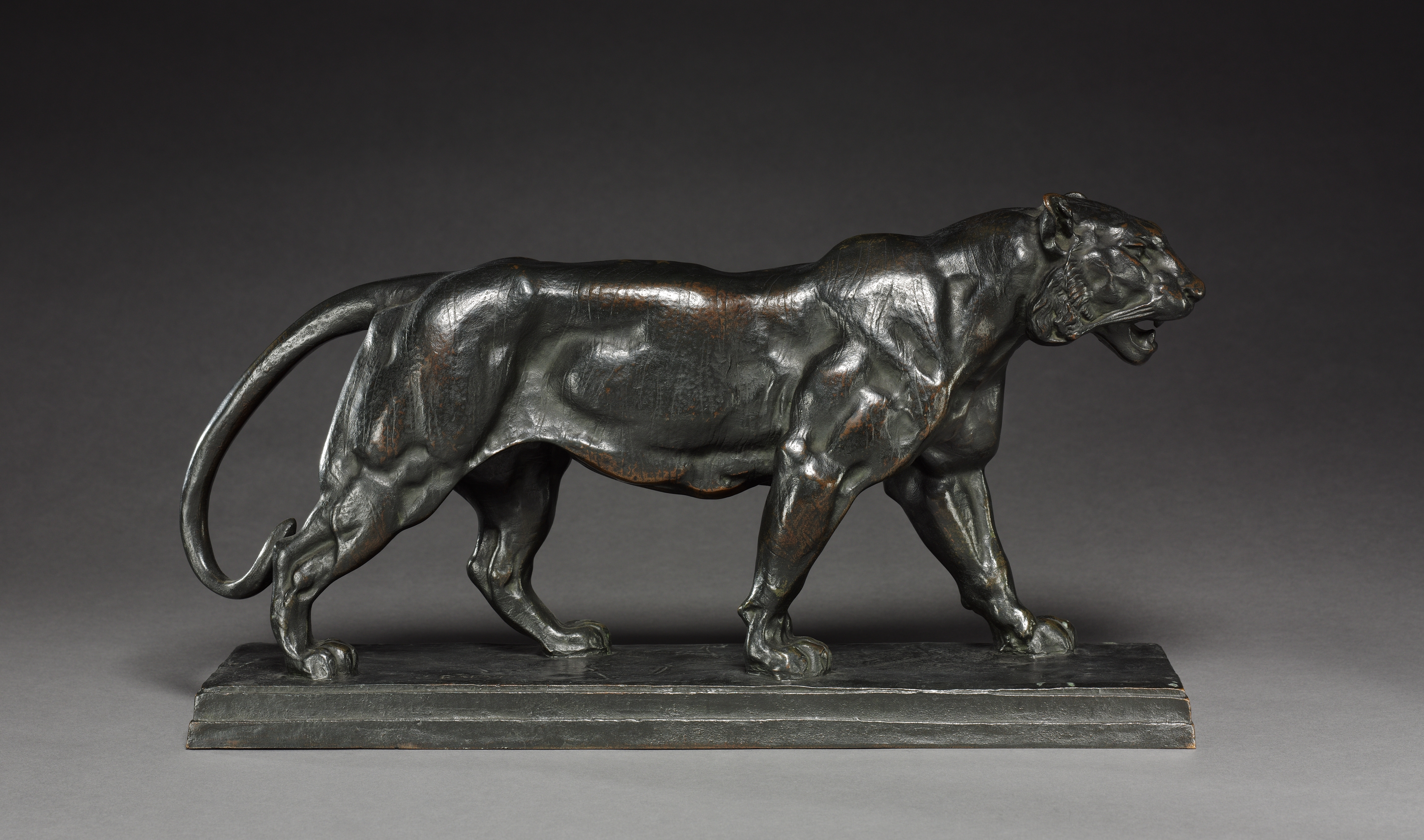 The sculpture depicts a large cat, specifically a tiger, in a walking position. The tiger is dark-colored, likely bronze, with a shiny finish and visible texture. It faces to the right with its mouth slightly open, showing the teeth. The tiger's body is muscular, with defined muscles visible under its skin. The head is positioned slightly above the ground, with the ears perked up and the whiskers visible. The tail extends behind the tiger, curved upward. The tiger stands on a rectangular base. The background of the image is dark gray, with a lighter gray surface that the sculpture is sitting on.