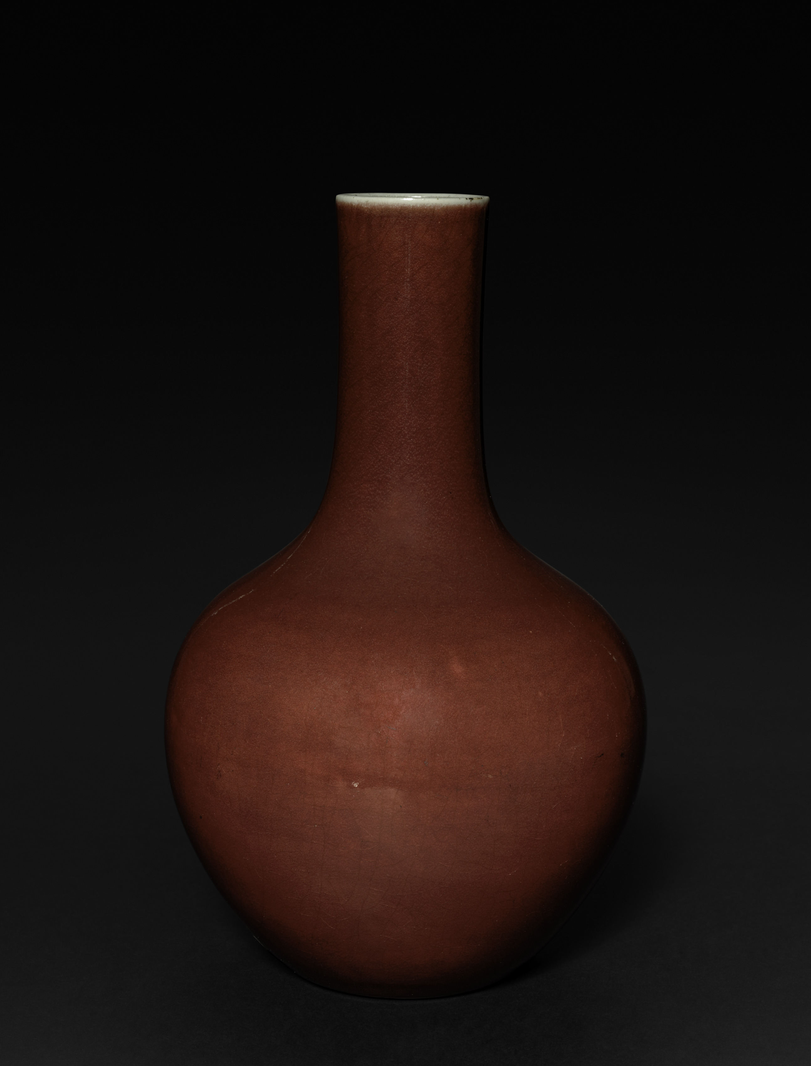 The vase is bottle-shaped. The body is bulbous then narrows into a long, thin neck. The base of the vase is not visible. The mouth of the vase appears to be a light color. The color of the vase is a reddish-brown. The background is black. The title of the image is "Bottle-shaped Vase".
