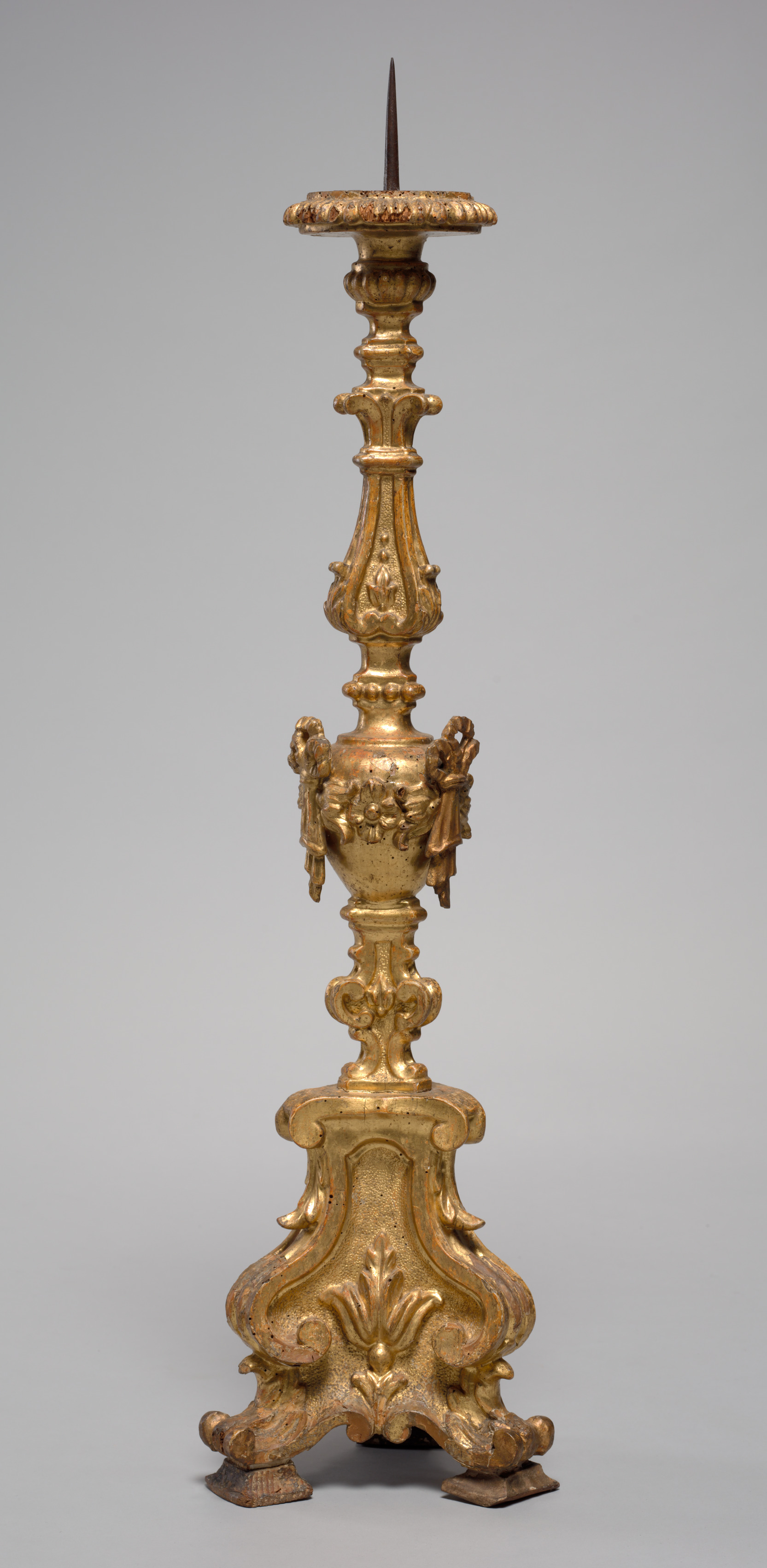 Candleholder by unidentified artist. The image shows a tall, ornate gold-colored candlestick holder. The base has a wide, flat shape with curved edges and a decorative design. It has three small feet at the bottom. The main body of the holder is slender and features multiple stacked decorative sections, including a wide middle section with two handles on either side that resemble leaves or flowers. Above this section, there are more intricate designs and patterns. At the very top, there is a small, flat surface with a spike protruding from it. The background of the image is plain gray.