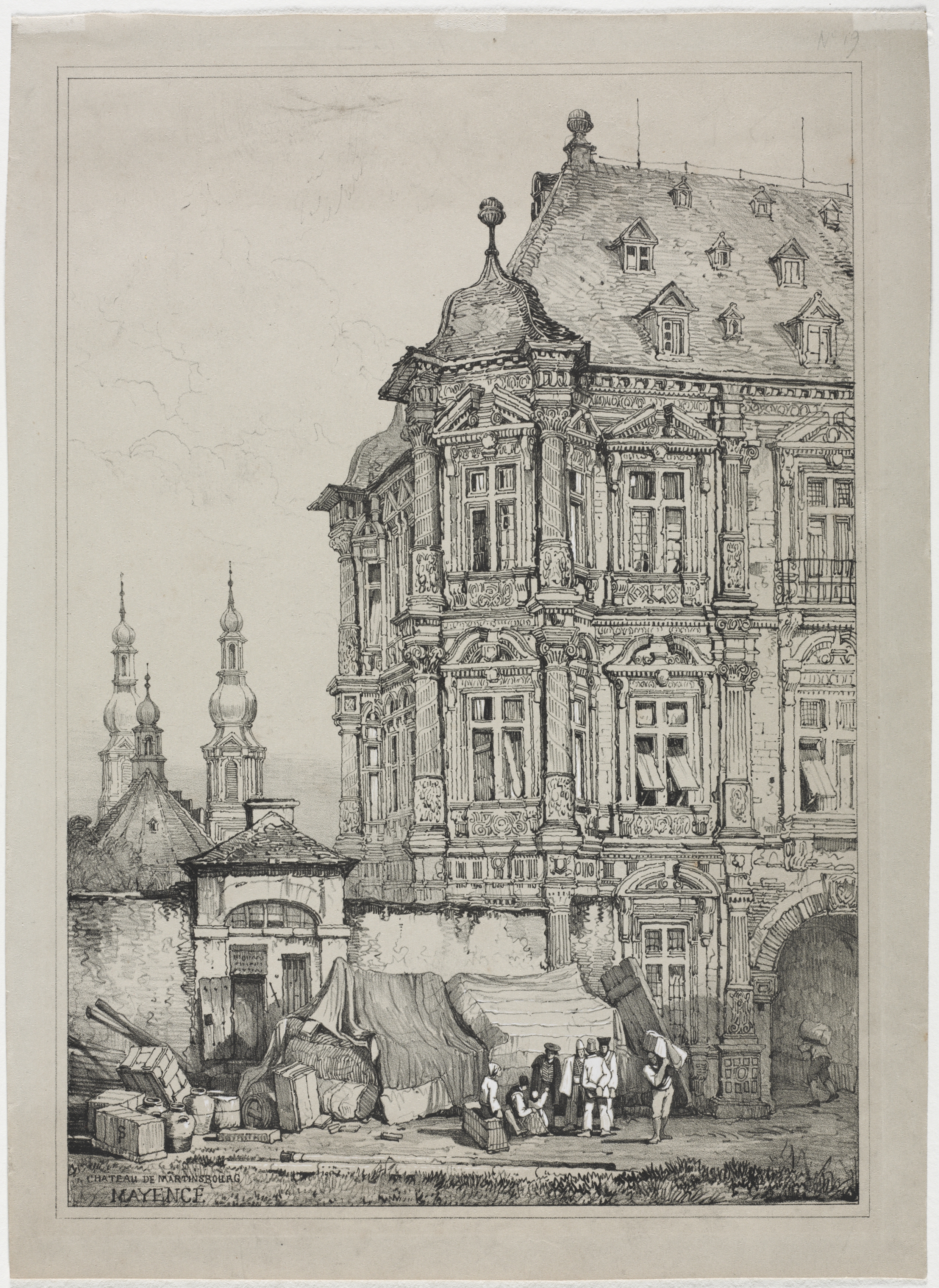 The image shows a black and white drawing of a large building. The building is on the right side of the image. It has three stories and a roof with multiple dormer windows. The building's facade is ornate, featuring many windows, balconies, and decorative elements such as carvings and moldings. In front of the building, there are several people standing around a tent-like structure. To the left of the building, there is another structure with a tower that has two spires. There are also several crates and barrels on the ground. The sky above is light-colored. The image is framed by a thin line border.