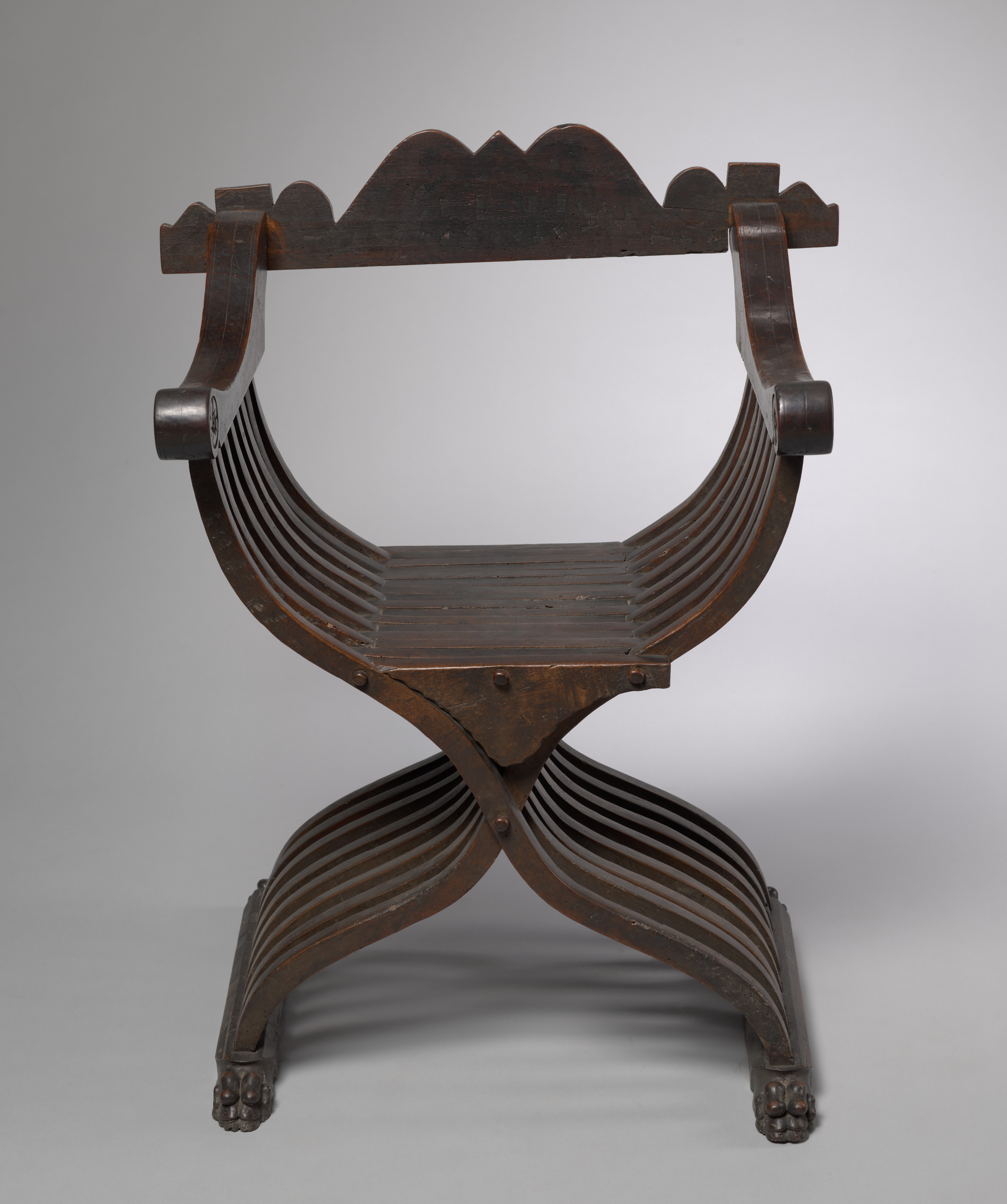 Dark brown wooden folding armchair, by artist "E.Thomas", with curved backrest featuring scalloped top edge, two curved side arms, slatted seat, and X-shaped base with four legs ending in carved feet; backrest folds down to rest on seat.
