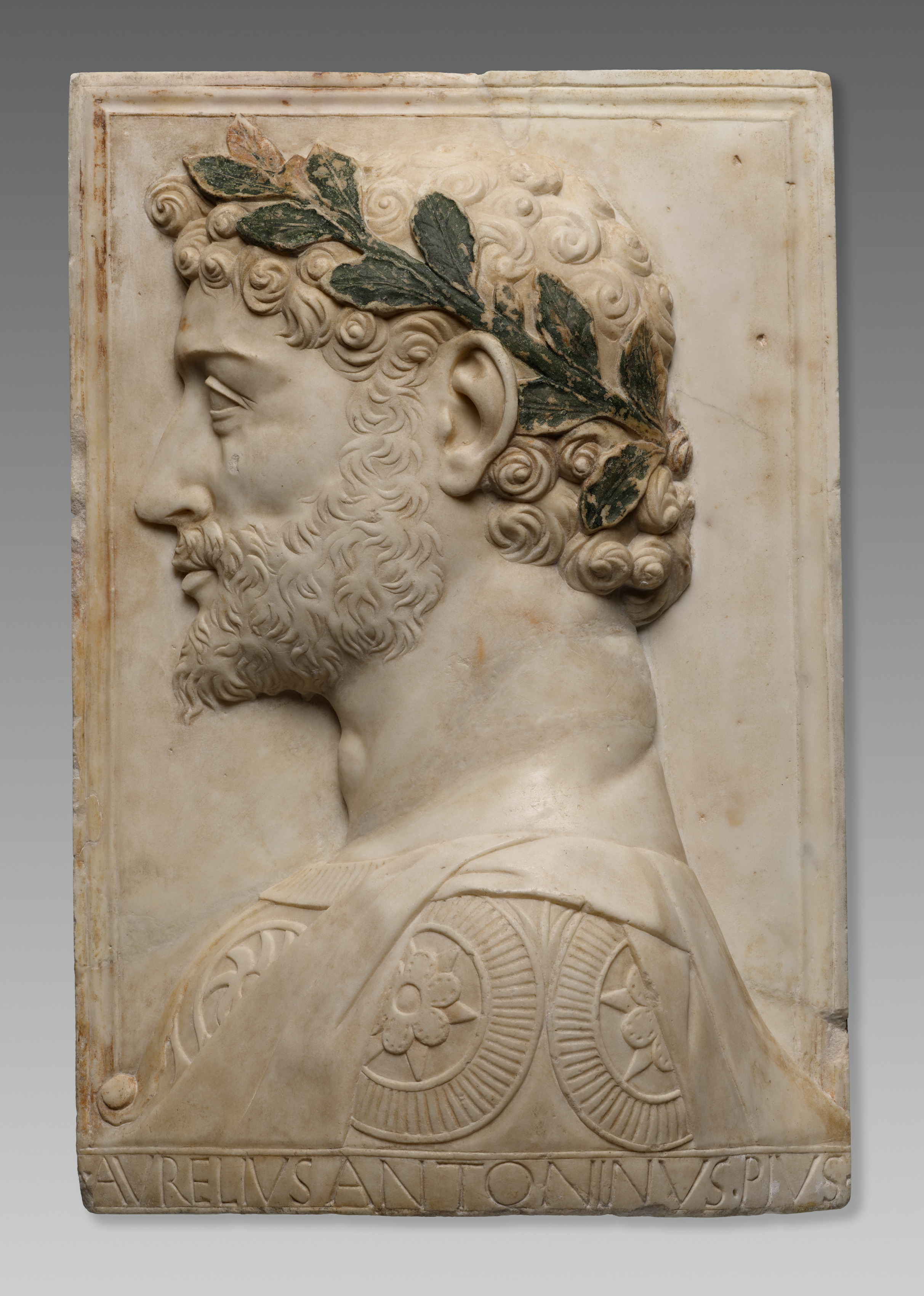 Marble relief depicting the bust of a man with curly hair and beard, wearing a laurel wreath on his head. The man has a short curly beard and mustache. His hair is curly and short. He is wearing a tunic with circular designs on the shoulders. The relief is rectangular with a raised border around the edge. The background of the relief is plain. The man is facing left. There is an inscription at the bottom of the relief. The inscription reads "A RELIUS ANTONINUS PIVS". The relief has a beige color with some darker spots. The background behind the relief is gray and white gradient.