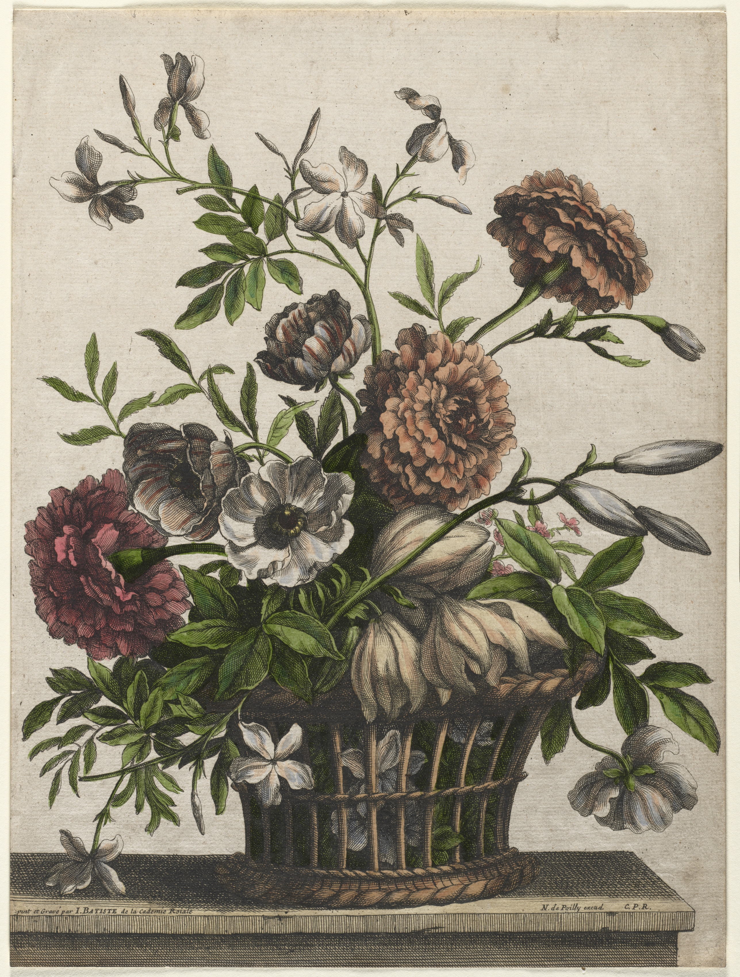 The image depicts a still life of a basket of flowers on a table. The basket is made of wicker and sits on a flat surface with a slightly raised edge. The basket contains a large bouquet of flowers with green leaves and stems. The flowers are various colors including white, brown, maroon, and pink. The flowers have many petals and are different shapes and sizes. Some of the flowers have buds that have not yet bloomed. The background is a light beige color with some darker spots and stains. The image appears to be an old illustration or print. The flowers include marigolds, anemone, and jasmine.