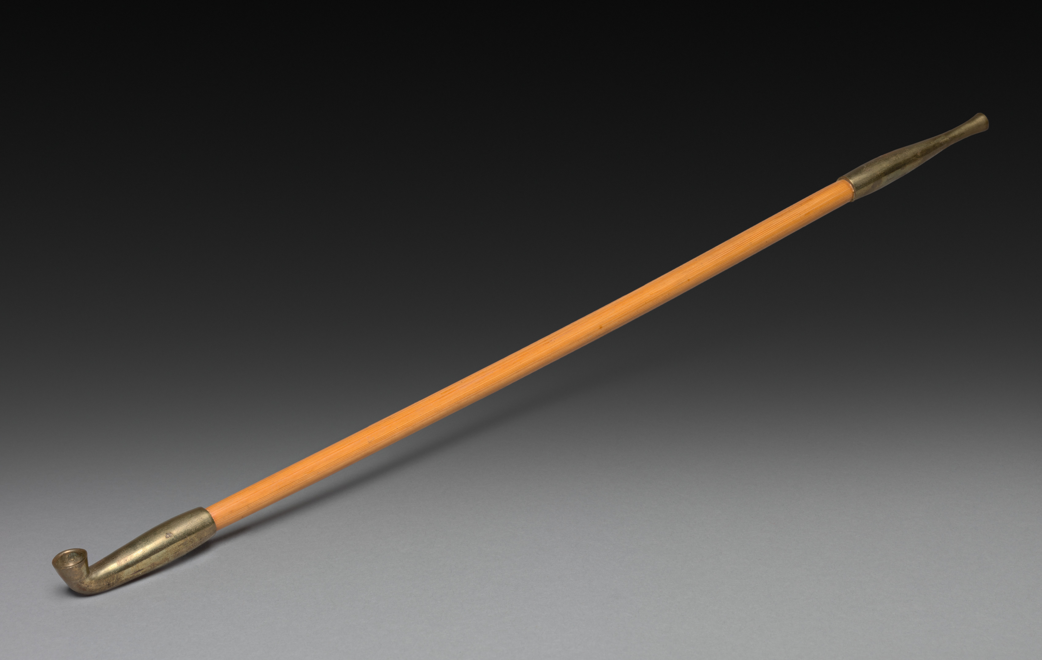 The image titled 'Tobacco Pipe' by an unknown artist depicts a long, orange object. The object is positioned diagonally from the bottom left to the top right. It has a brass-colored metal piece at each end. One end is shaped like a pipe bowl and stem. The bowl is on the left and points downwards, while the stem extends to the right and then curves back down. The other end tapers to a point. The background transitions from black at the top to gray at the bottom. The object casts a shadow on the surface below it. The surface and background appear to be flat.