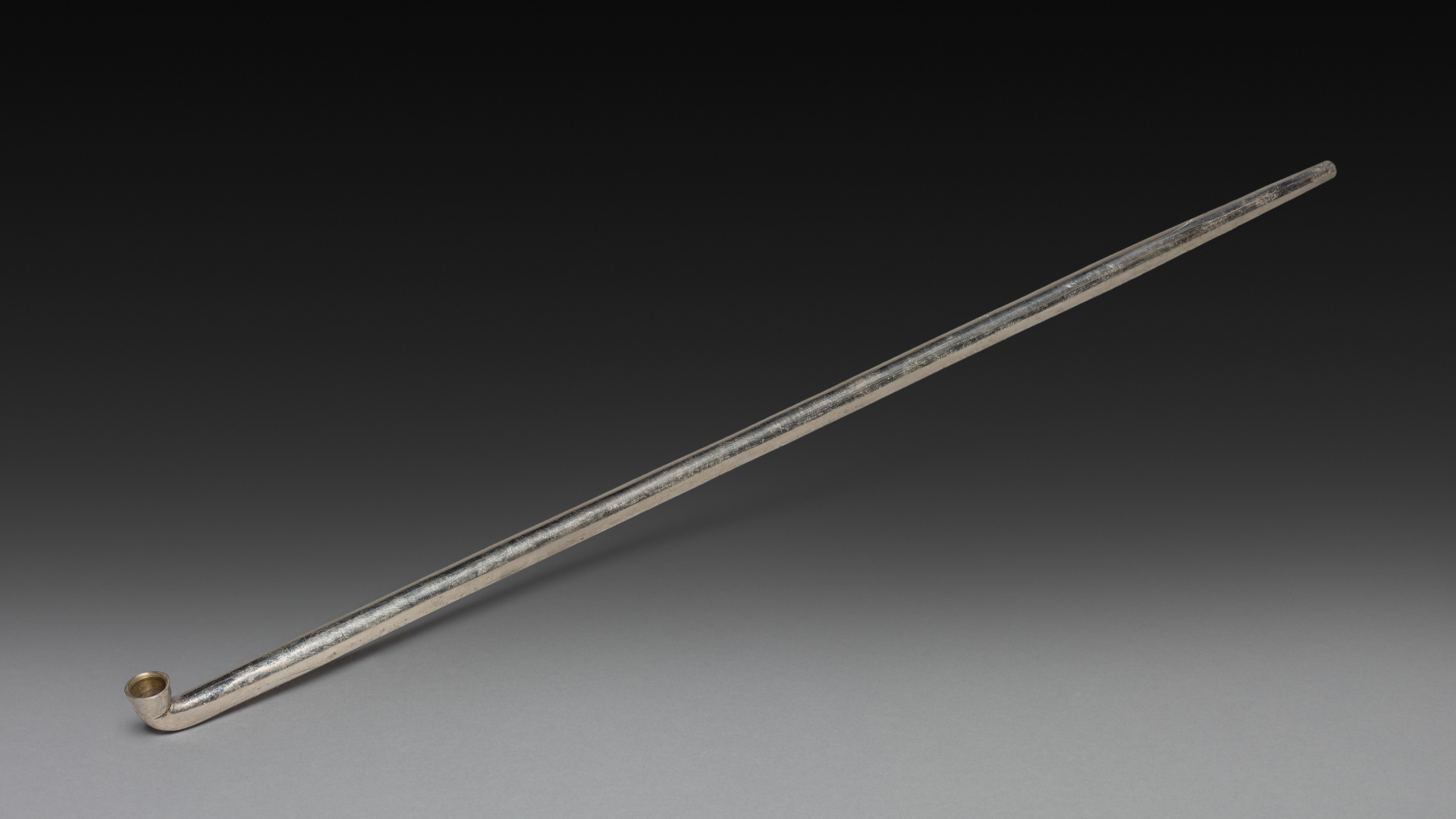 The image shows a long, silver-colored metal object with a curved end. The object is positioned diagonally from the bottom left to the top right of the image. It has a long, thin, cylindrical body with a rounded end on the left side and a small, circular opening at the very end. The object appears to be made of metal, possibly silver or chrome, and has a smooth surface. The background of the image is a gradient that transitions from black at the top to gray at the bottom. The title of the image is "Tobacco Pipe" and the artist is unknown. The object in the image is a tobacco pipe by an unknown artist titled "Tobacco Pipe".