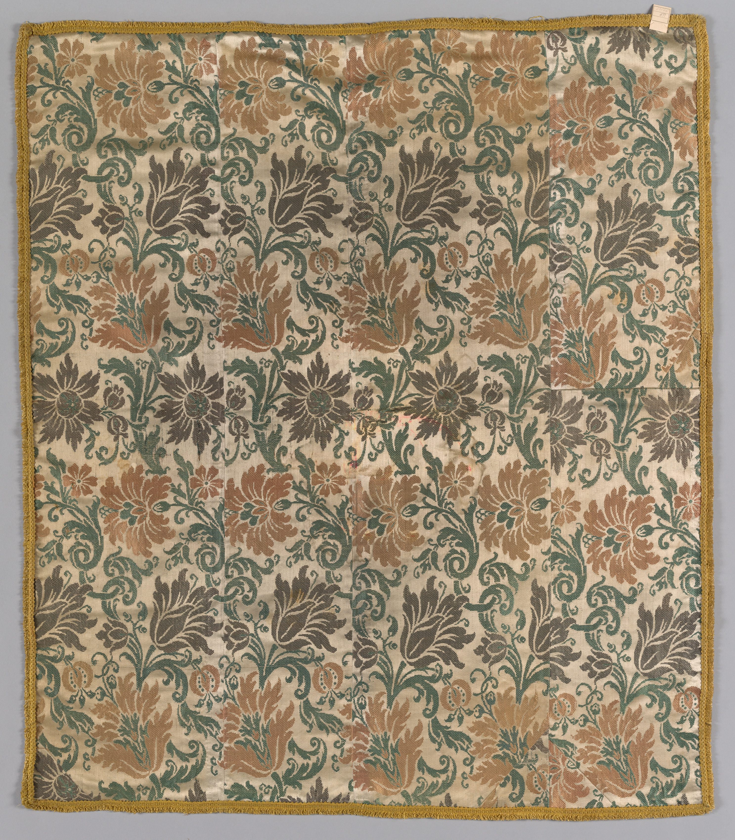 Silk textile by artist, rectangular shape with a yellow fringe border around the edges. The background of the textile is cream-colored. The textile features a repeating pattern of flowers and leaves in shades of brown, green, and tan. The flowers have multiple petals and are connected by curved stems and leaves. The pattern is densely woven, with little visible background. A small piece of tape is attached to the top-right corner.