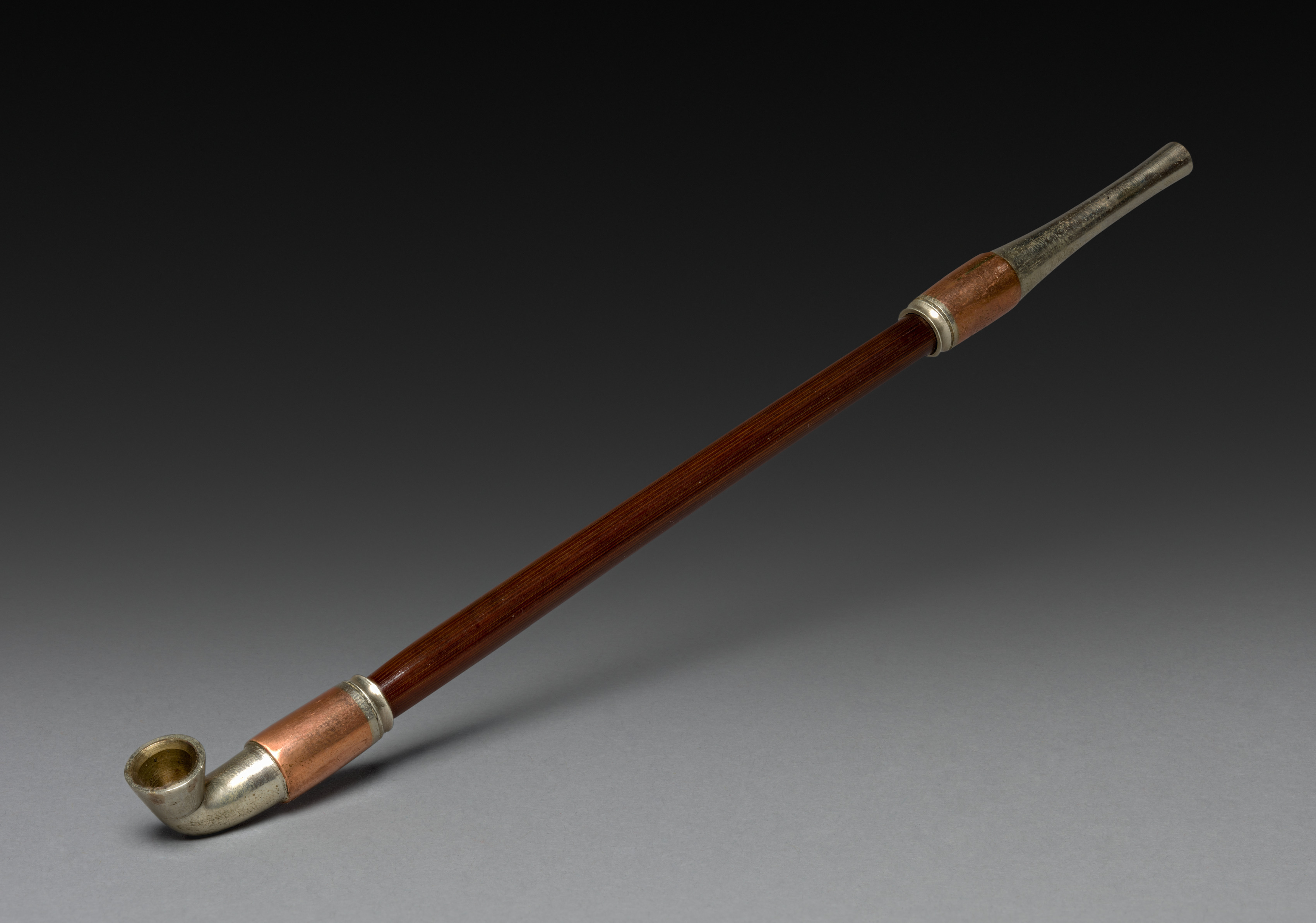 Long, brown wooden pipe with metal and copper accents. The pipe has a metal mouthpiece at the end. The bowl of the pipe is made of metal and copper. There are metal bands around the pipe, one near the bowl and one near the middle. The pipe extends to a metal stem at the end. The background is dark gray to black gradient. The pipe titled "Tobacco Pipe" and is by an unknown artist.