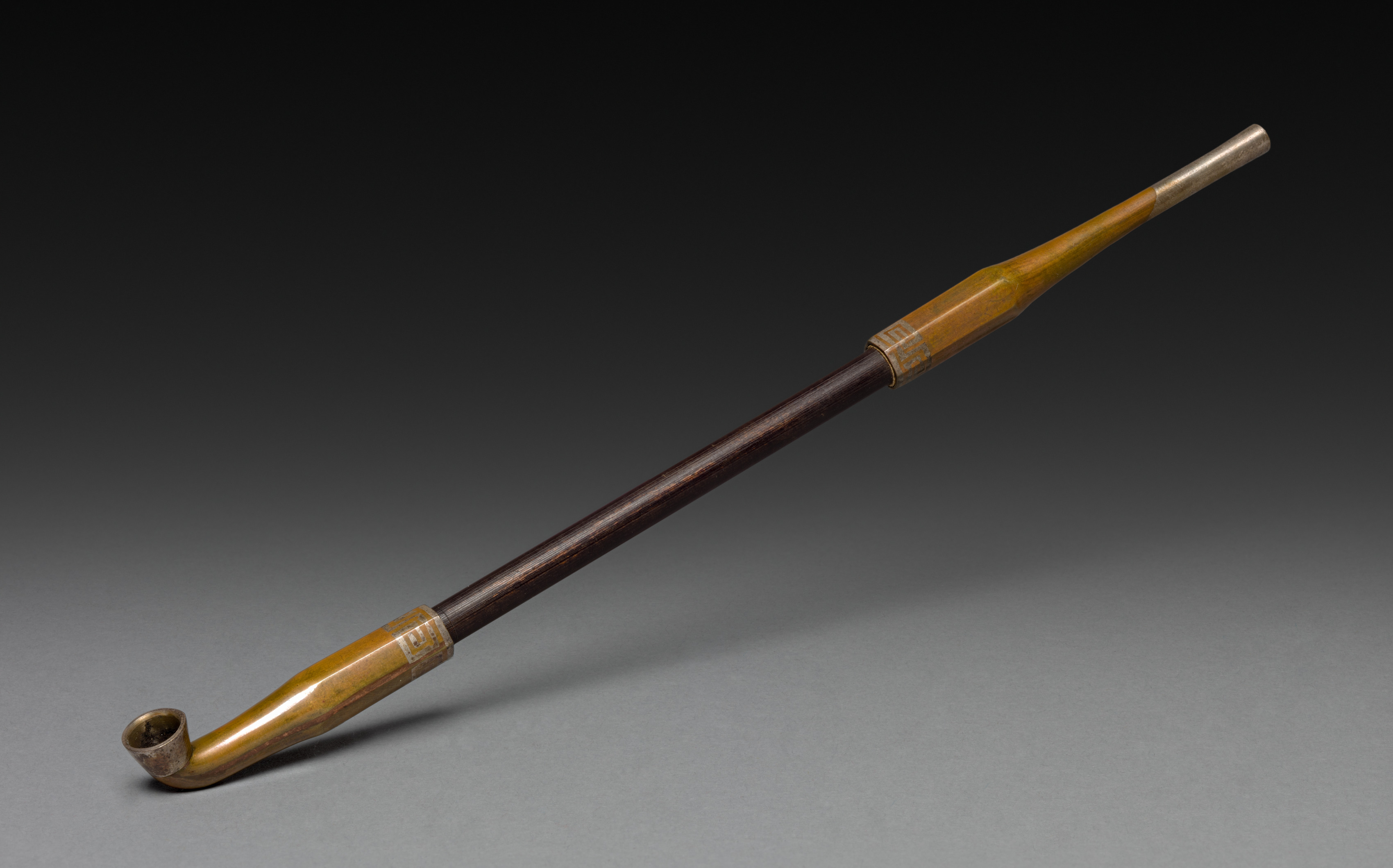 The title is "Tobacco Pipe" by artist unknown. Long, thin, curved object, likely a pipe. The pipe has a dark brown wooden stem, approximately two-thirds of the way down from the top. Attached near the bottom of the dark stem and on the top is a lighter brown wood. The pipe bowl at the end is made from a rough, dark brown material. The pipe bowl curves down and to the left. Three metal bands are wrapped around the pipe. The metal bands are positioned on either side of the seam where the light and dark wood meet and one on the very end of the pipe. The background gradates from black at the top to dark gray at the bottom with the pipe casting a shadow to the right.