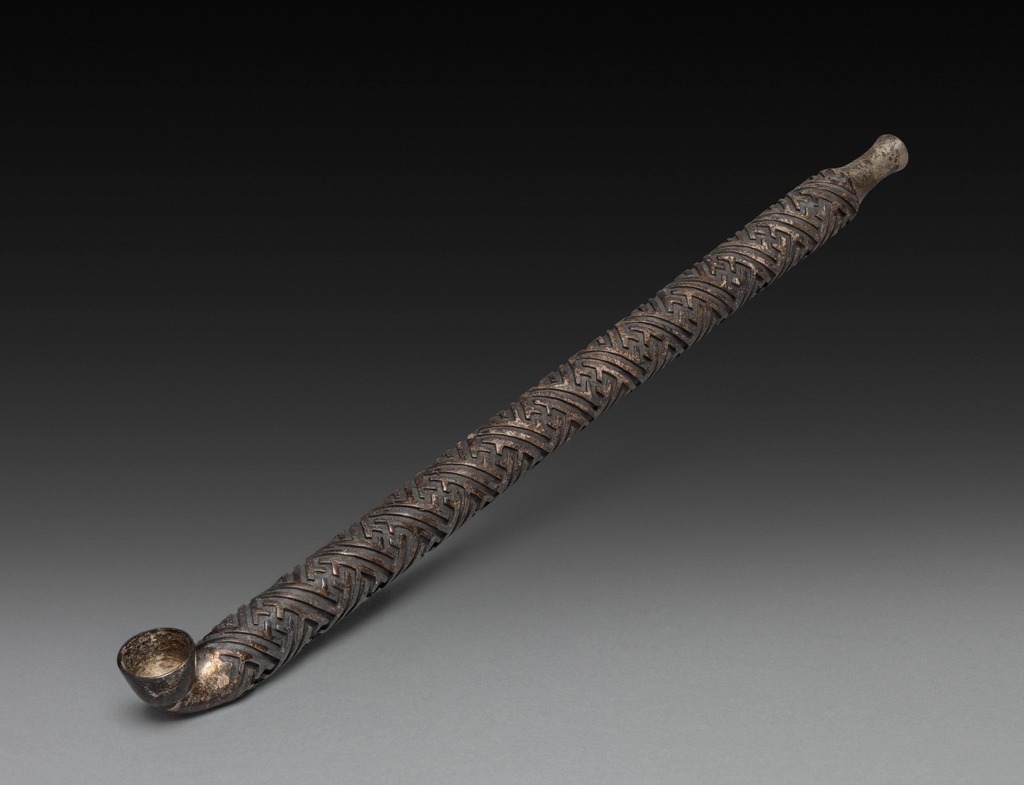 The object is titled "Tobacco Pipe" by an unknown artist. The pipe is long and thin with a rounded bowl at one end. The pipe's surface features intricate Celtic knotwork designs. The pipe's color appears to be primarily dark brown or black with some gold. The background of the image transitions from black at the top to gray at the bottom. The pipe is positioned diagonally on the gray surface. The pipe's bowl is on the left. The pipe tapers to a rounded point at the right end. The object appears to be made of metal.