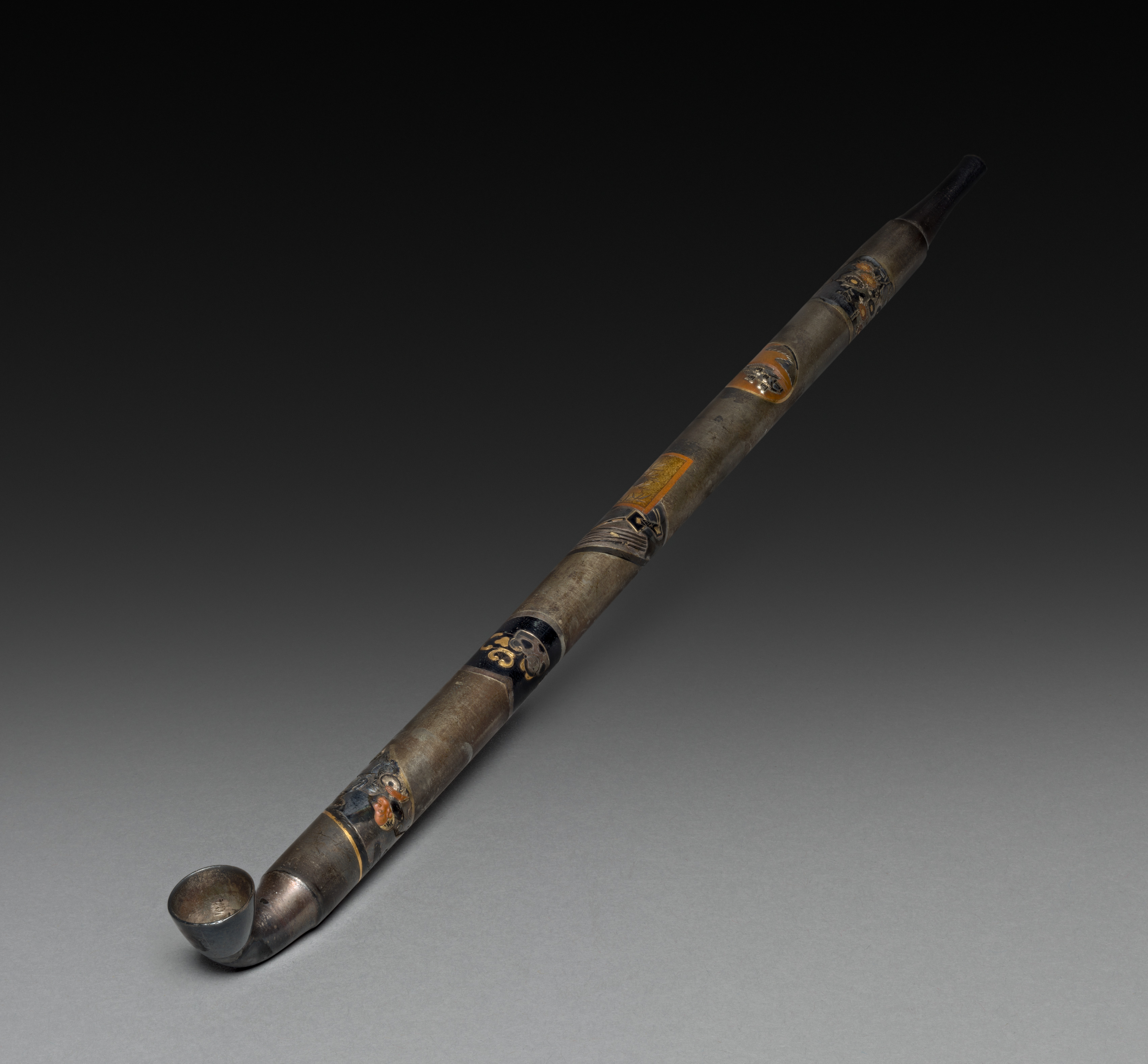 Long, curved tobacco pipe with bowl at one end and tapered stem at the other, made of wood or metal, featuring various colorful inlaid designs of people, flowers, and patterns; stem and bowl darkened.