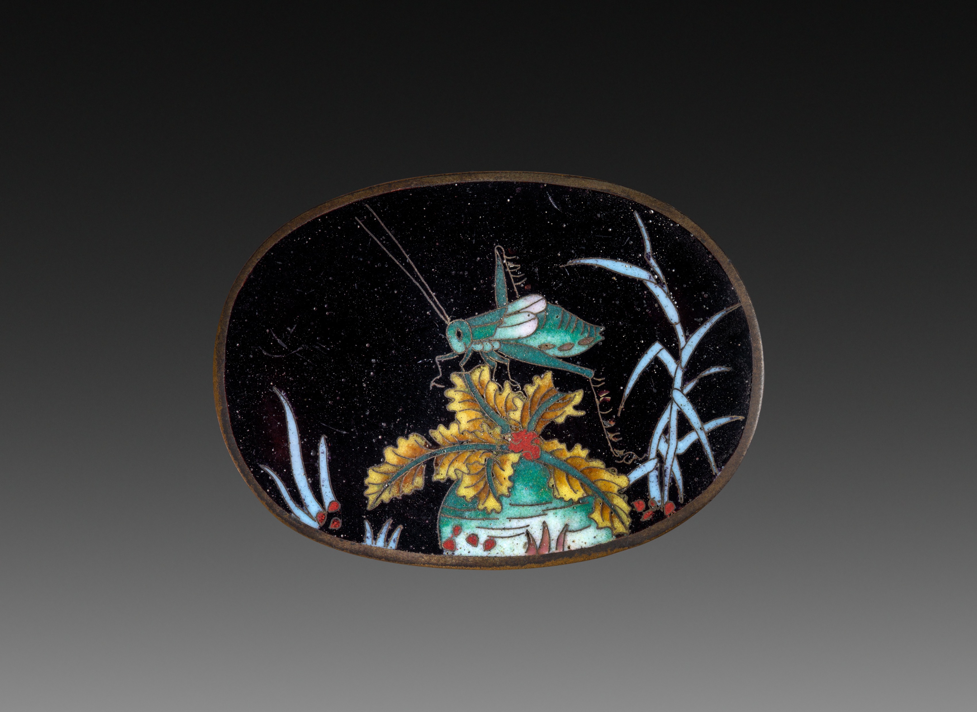 Oval belt buckle with rounded edges. The buckle's background is black with a brown border. A green cricket with a white underbelly faces left. The cricket's antennae extend to the top edge. Yellow leaves are clustered at the bottom center. The leaves sit atop a green and white base with red dots. Light blue plant-like structures are on either side. The background behind the buckle gradates from black to gray.