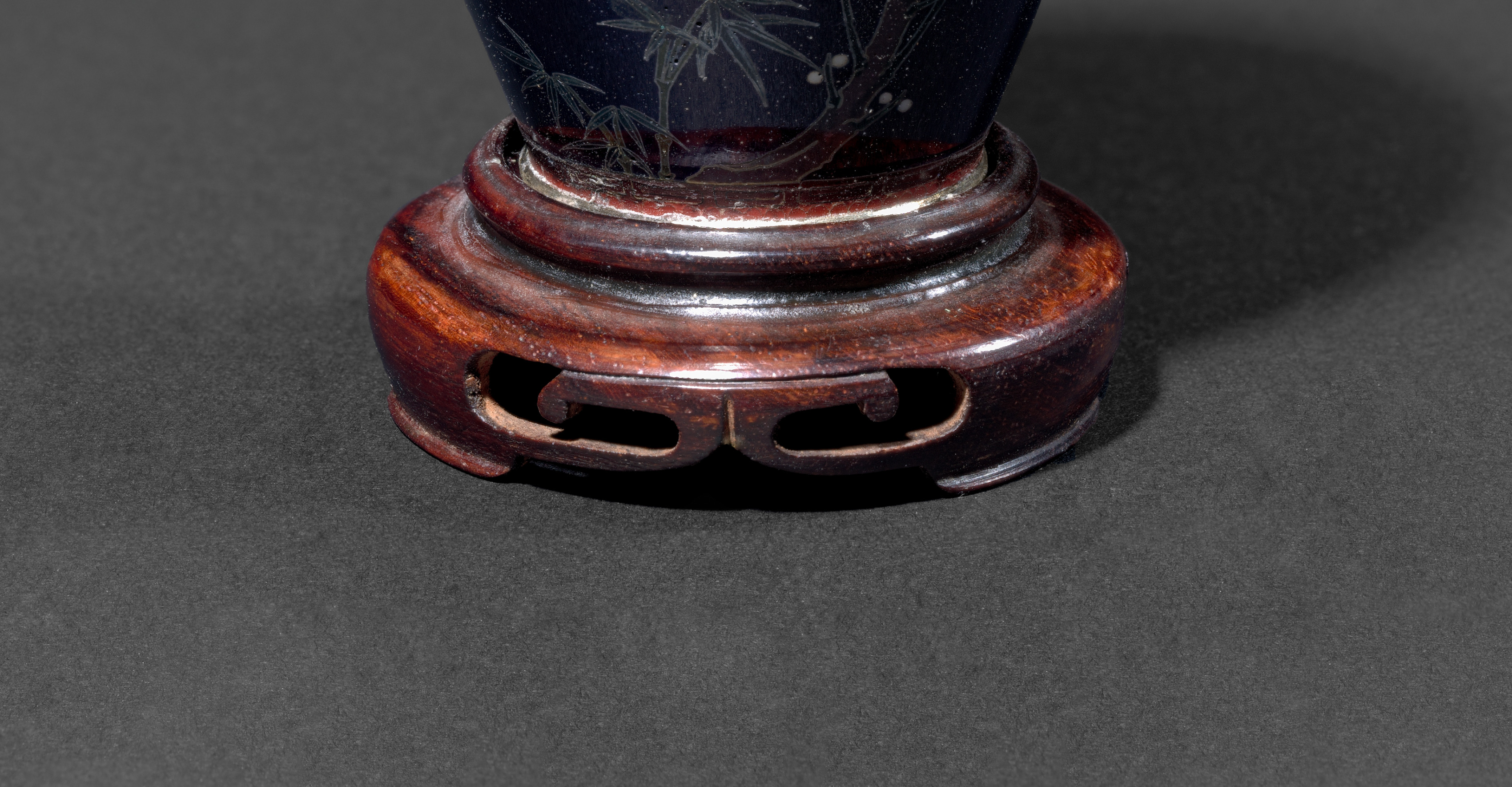 The base of a vase by an unknown artist titled "Vase (base)" features a dark brown wooden base. The base has a rounded shape with a wide lip at the bottom, and a narrower lip around the top where it meets the vase. The base has three curved cutouts on the bottom. The vase itself is dark blue with a white design. The background of the image is dark gray.