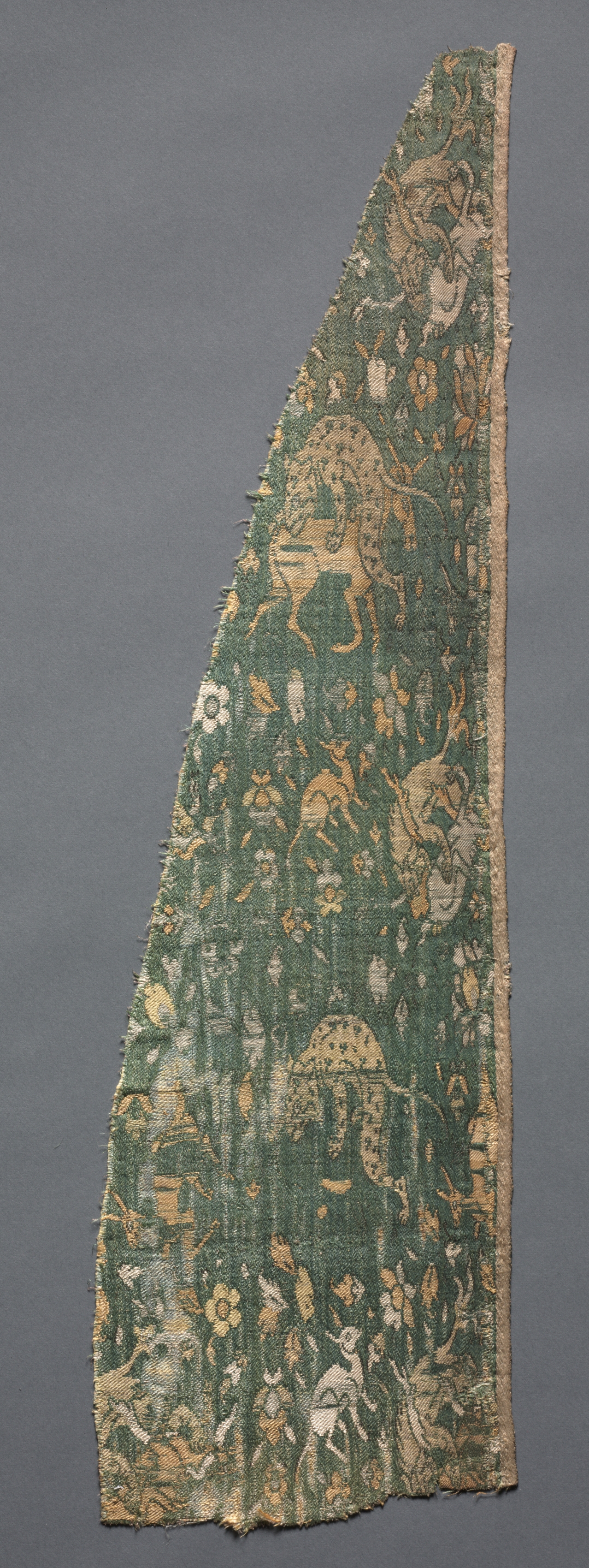 Green and gold colored fabric with a patterned design. The fabric is a long, irregular triangle with a straight right edge and a frayed left edge. The fabric depicts a repeating design of various animals including deer, monkeys, birds, lions, and elephants. The animals are surrounded by plants and flowers. The fabric has a worn, aged appearance with frayed edges and some areas of discoloration.