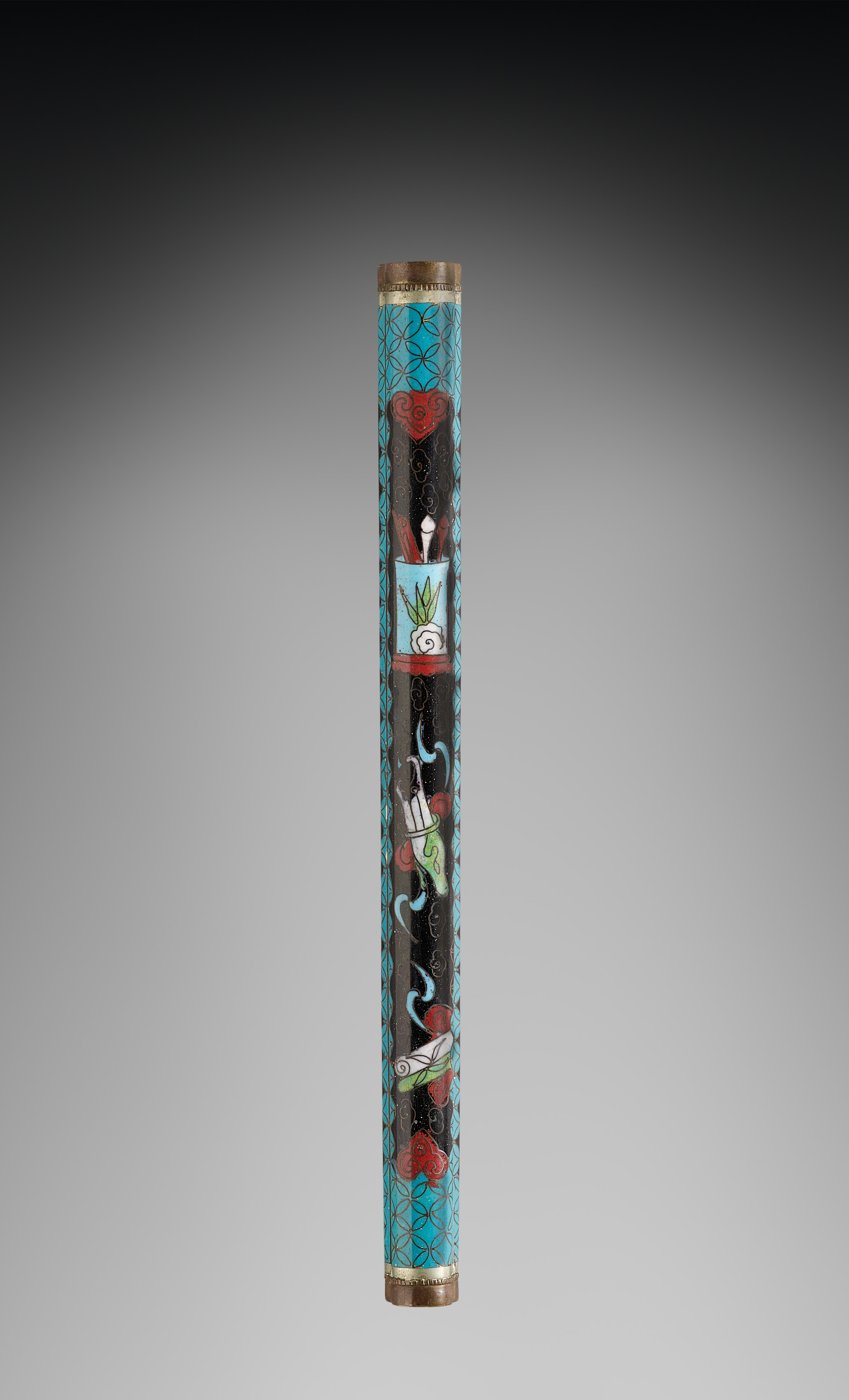 Cylindrical case with a bronze-colored metal top and bottom. Black body with turquoise accents and pattern. Red hearts, white chopsticks, knife, and green and white vegetables are depicted.