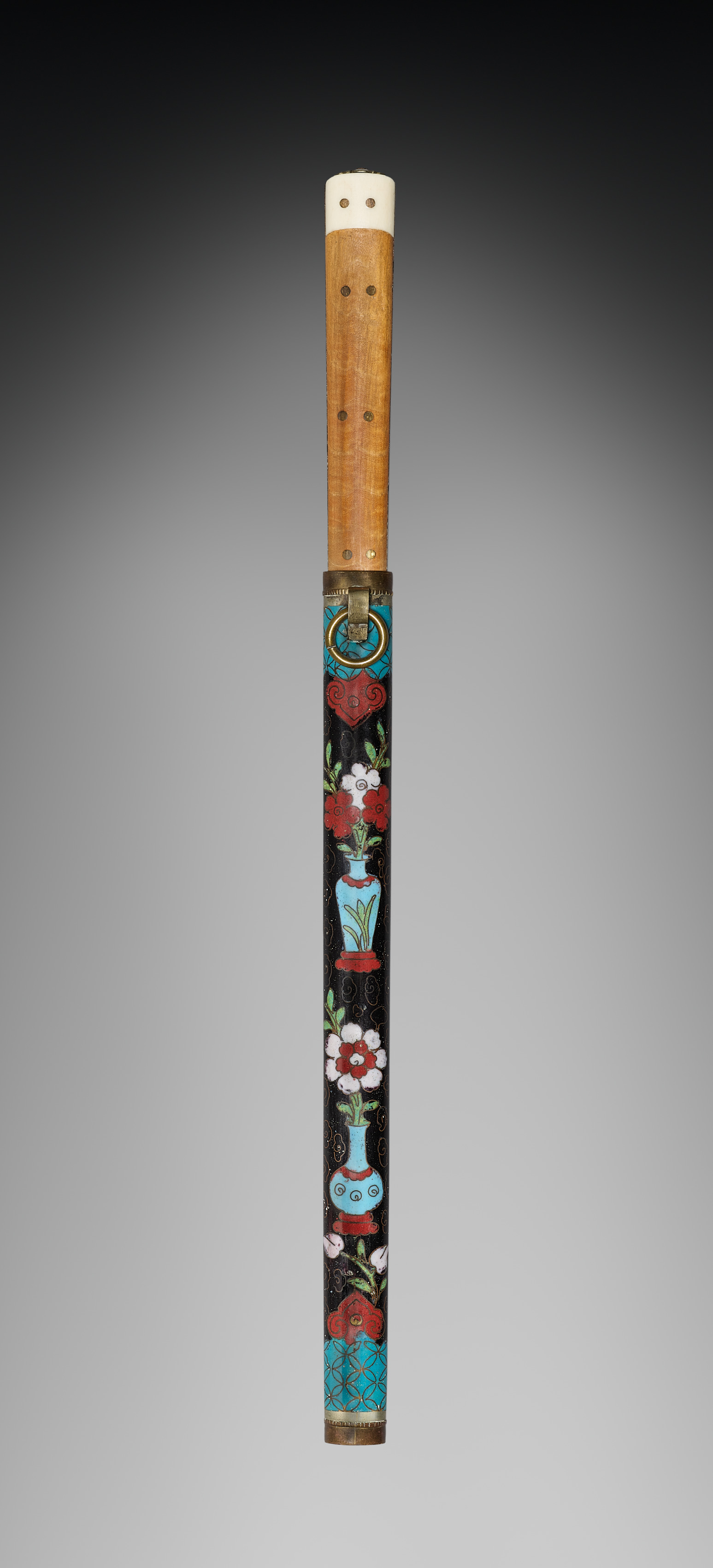 Long, thin object with a wooden handle and a decorated sheath. The handle is light brown with a white cap on the end and small holes along its length. The sheath is black with a gold ring at the top and features a colorful design including red and white flowers, blue and red vases, and a red heart. The background is gray with a gradient that gets darker towards the top. The object is likely a souvenir trade item, specifically a kit with chopsticks and a knife. The image displays the item by artist Souvenir Trade.