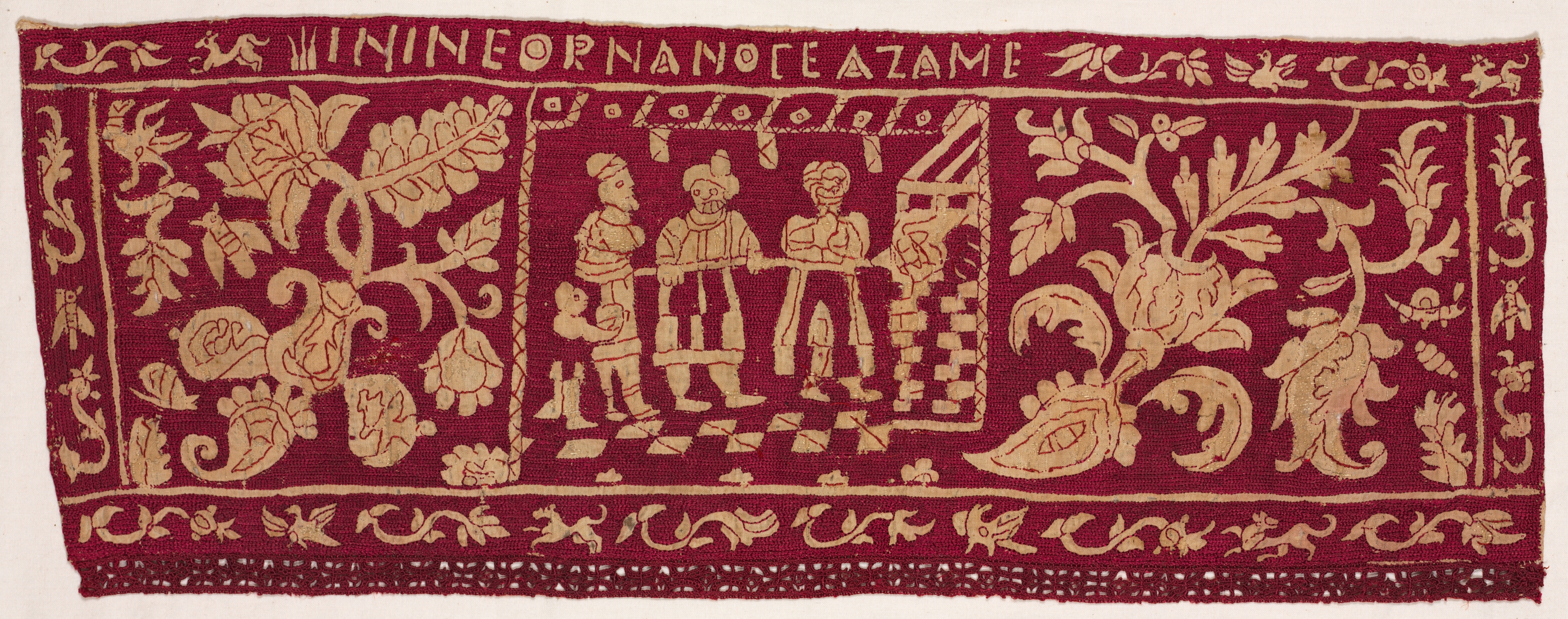 Red fabric with gold embroidery, featuring a central scene of three people and a dog standing around a checkerboard-patterned surface. The scene is flanked by a leafy plant on the left and a tree on the right. The fabric has a decorative border with leaves, birds, and animals. The top of the fabric features an inscription in gold letters. The fabric's edges are rough and frayed, with a visible woven pattern along the bottom edge. The fabric appears to be rectangular in shape. The scene depicts people wearing long-sleeved shirts and head coverings. The dog appears to be small in size. The checkerboard-patterned surface has a short object standing on it.