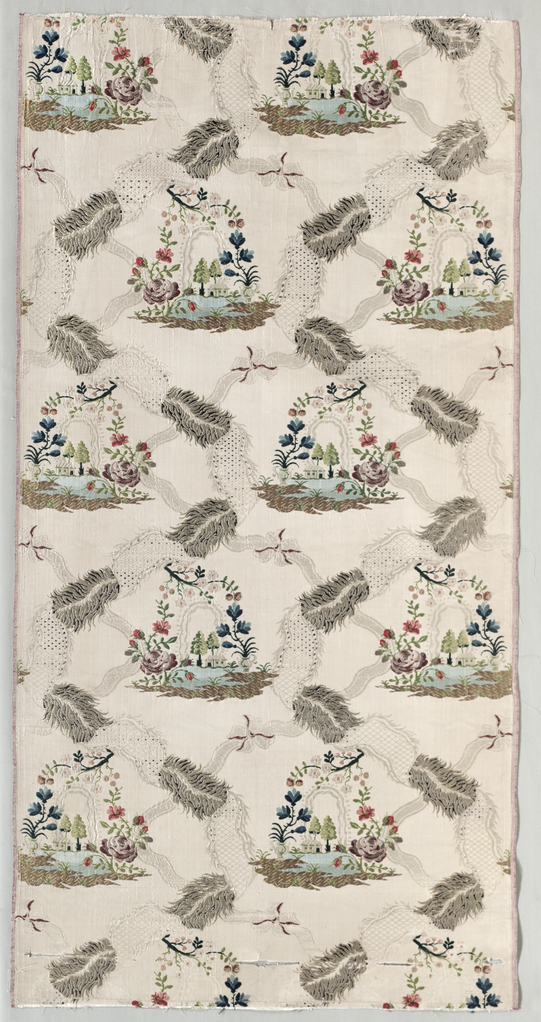 The image shows a piece of silk brocade fabric by an unknown artist. The fabric is rectangular with a light beige background. The fabric features a repeating pattern of eight identical scenic motifs, arranged in four rows and two columns. Each scenic motif depicts a cluster of trees and flowers in shades of blue, pink, green, and brown, with a light blue body of water. The scenic motifs alternate with curved bands of textured, light brown material resembling fur or feathers. The bands are interspersed with small, scattered floral motifs and bows in pink and blue. The fabric appears to be antique, with a slightly worn and frayed appearance. The image shows a plain gray background. The edges of the fabric are rough and uneven.