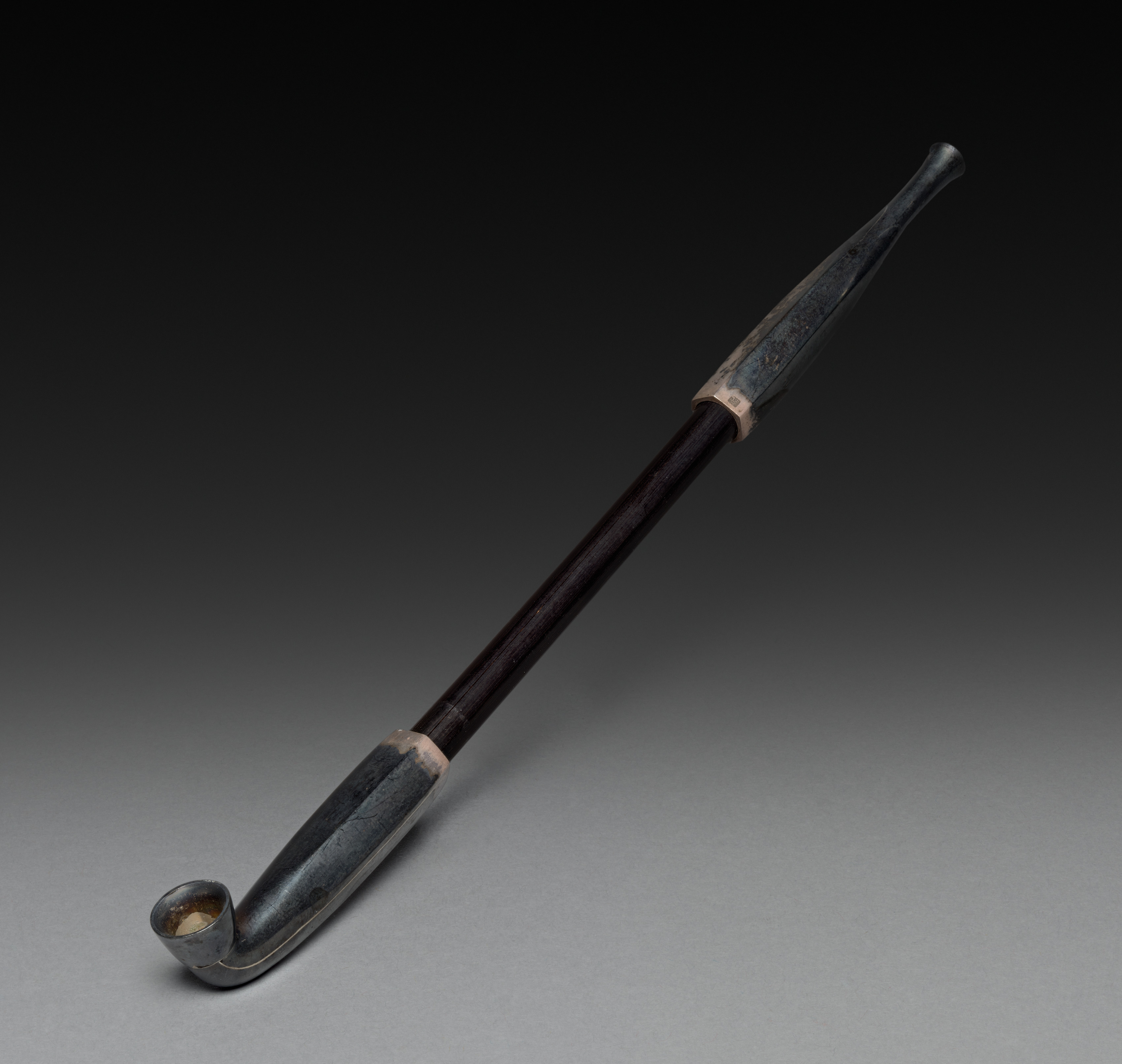 The image depicts a "Tobacco Pipe" by an unknown artist. The pipe has a dark brown wooden stem and a darker brown bowl. The stem tapers from the bowl to the mouthpiece end. The bowl is on the lower left side, and the mouthpiece points up and to the right. Metal bands are around the bowl and middle of the stem. The background transitions from black at the top to gray at the bottom. The pipe casts a shadow on the surface below. The surface and background meet at a diagonal line.