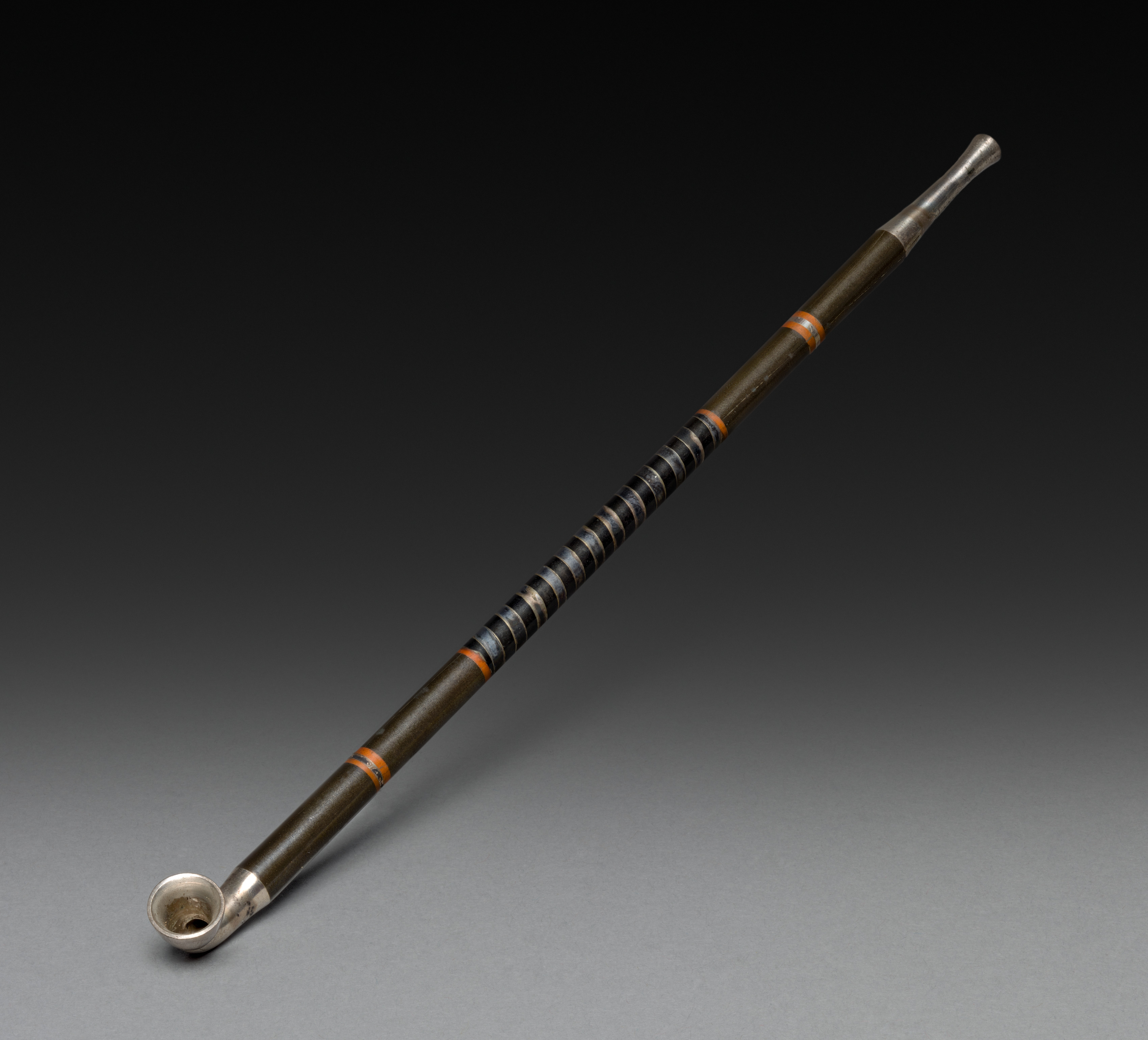 Long, thin, dark brown object with silver accents at both ends. The object has a bowl-shaped end, likely a pipe bowl, and a stem with a rounded tip. The stem features a series of ridges and orange bands around it. The background is a gradient from black to gray. The object titled "Tobacco Pipe".